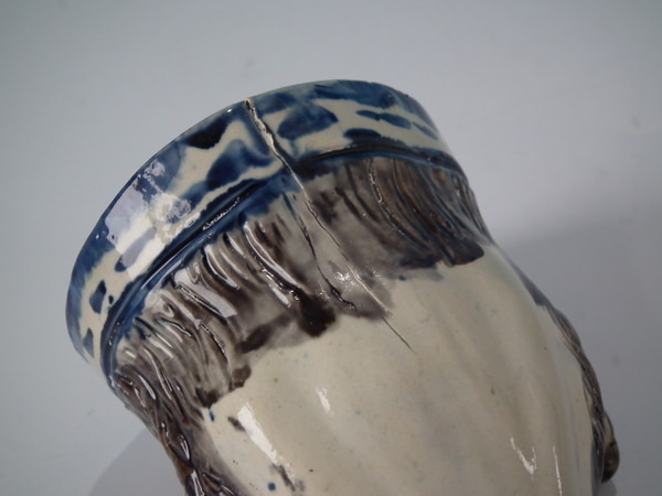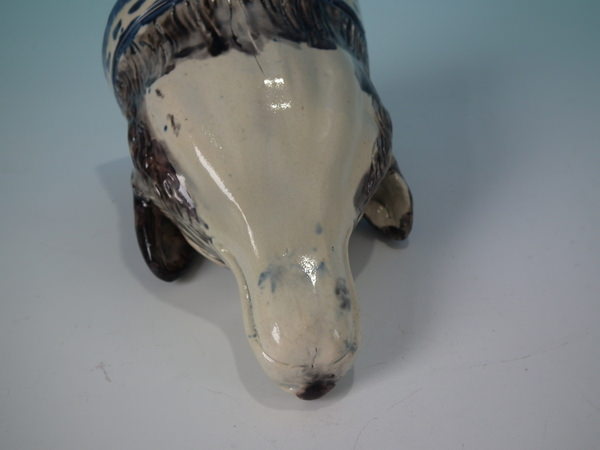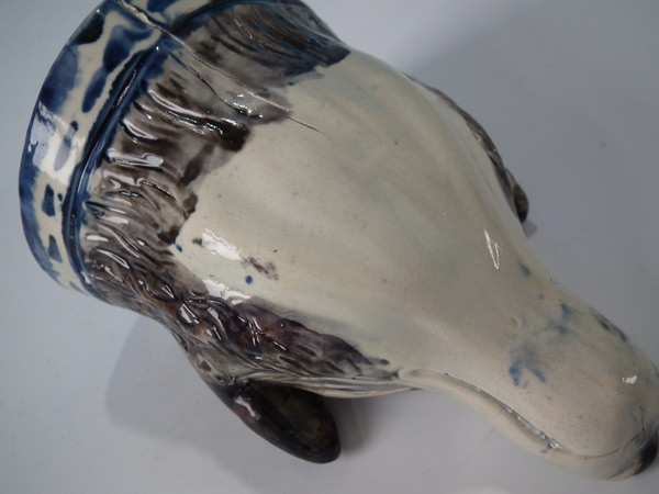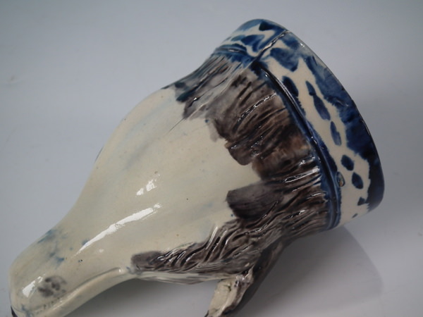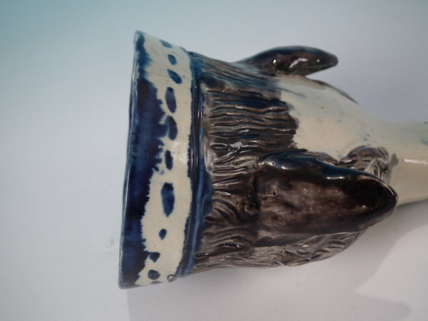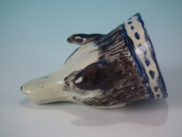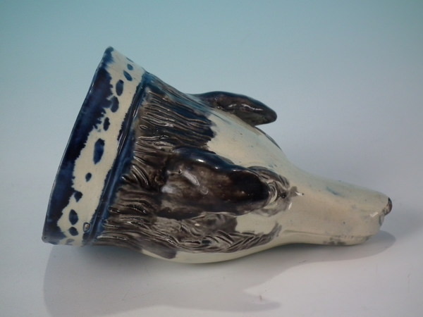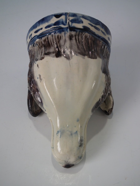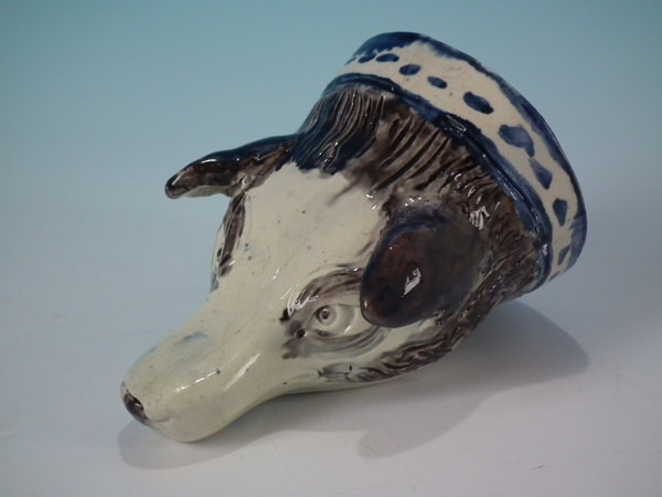 pre-Victorian, circa 1800. 3.1ins high, 5ins wide, 3.3ins depth. Staffordshire pearlware stirrup cup with a hunting theme which features a fox head, directly on the ground, no base.