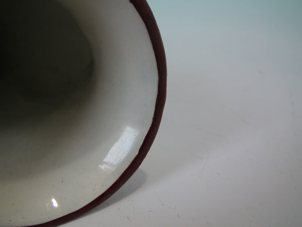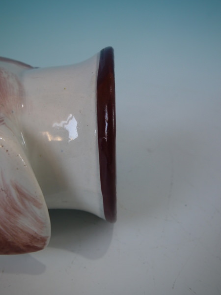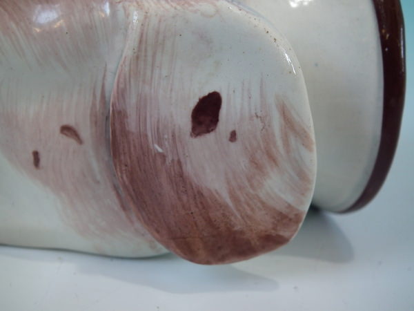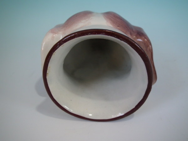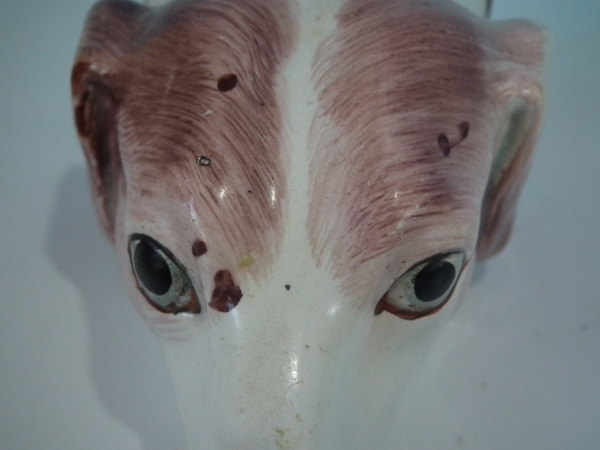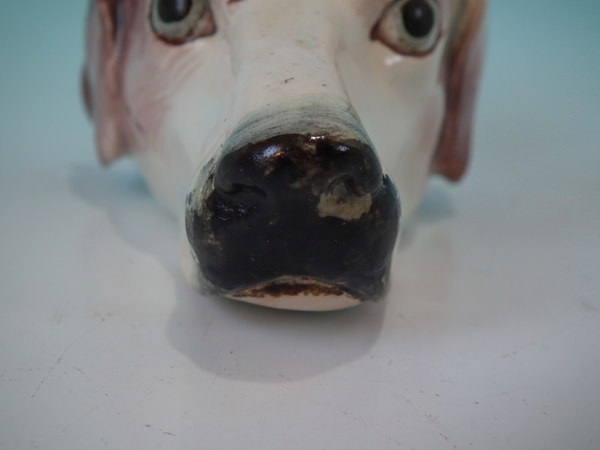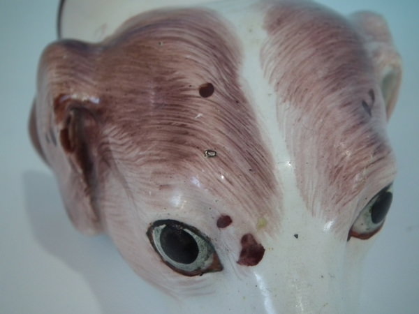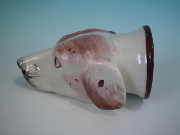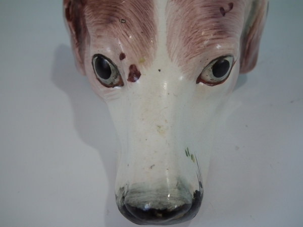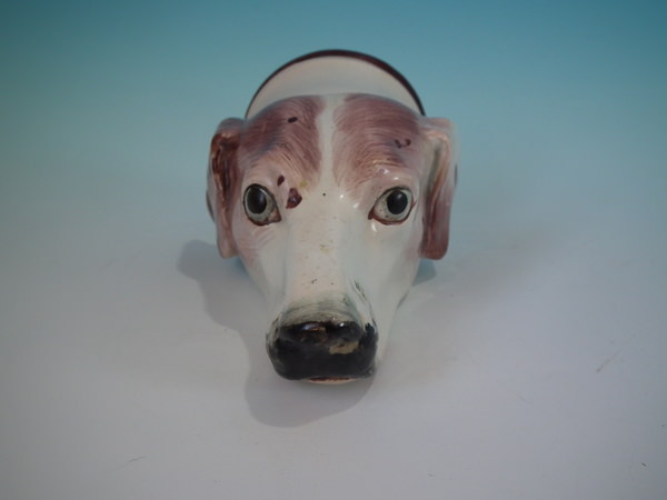 Victorian, circa 1840. 2.8ins high, 5.4ins wide, 3.1ins depth. Staffordshire pearlware stirrup cup with a hunting theme which features a brown and white hound's head, resting directly on the ground, no base.