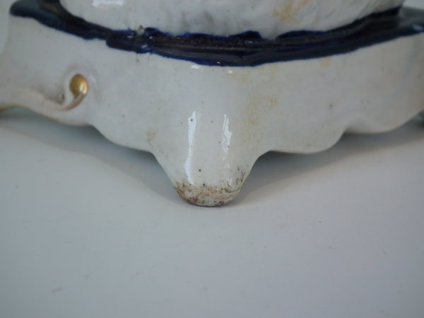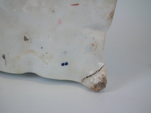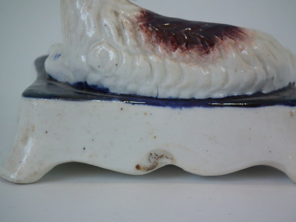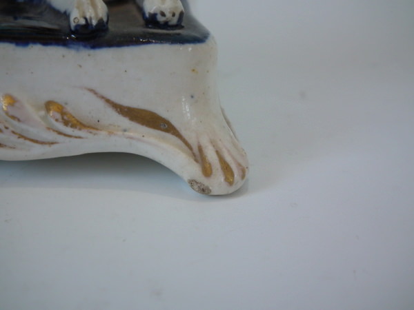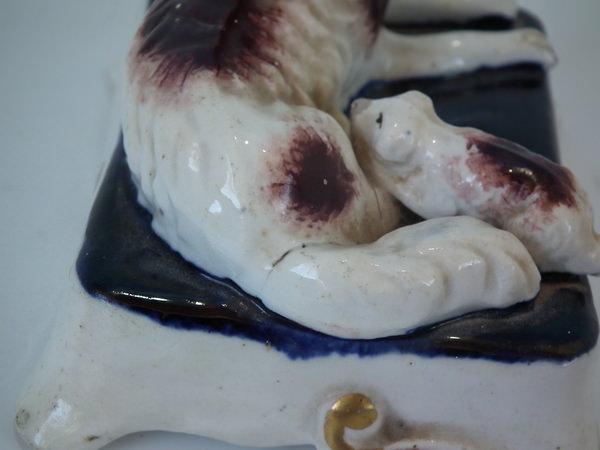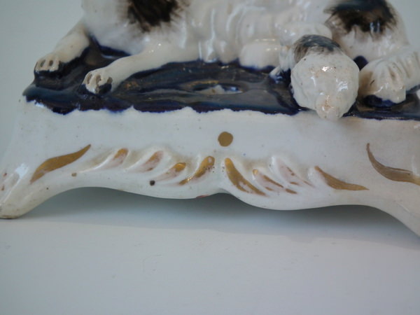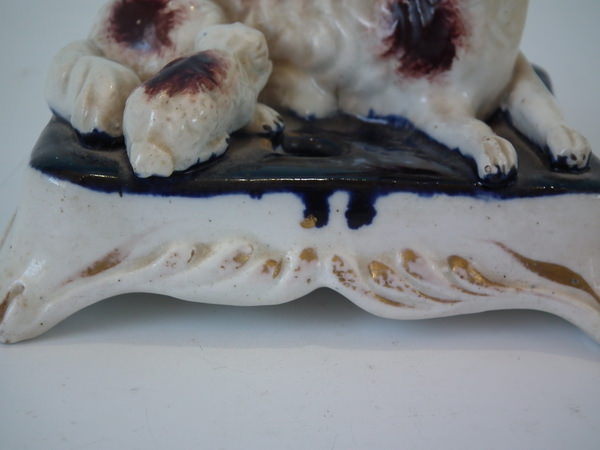 KILN EFFECTS: shrinkage crack to underside of of base and one also to spaniel's hind left leg.