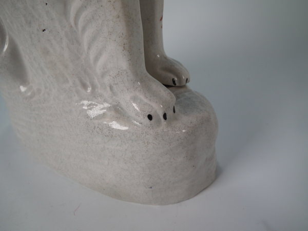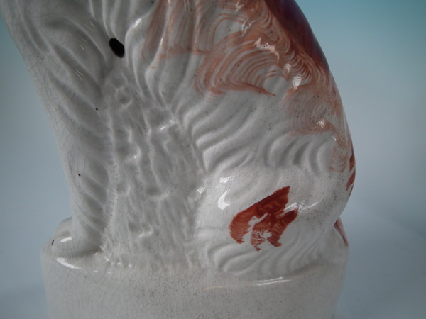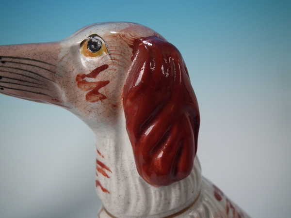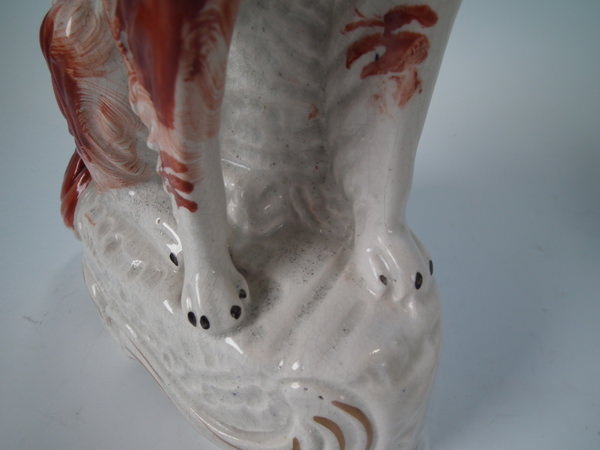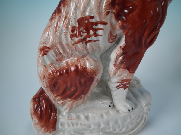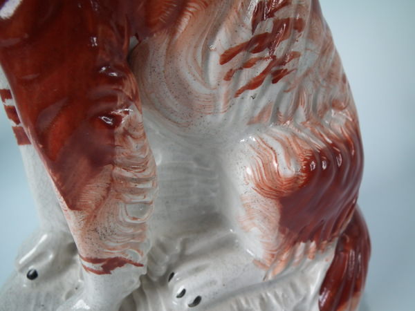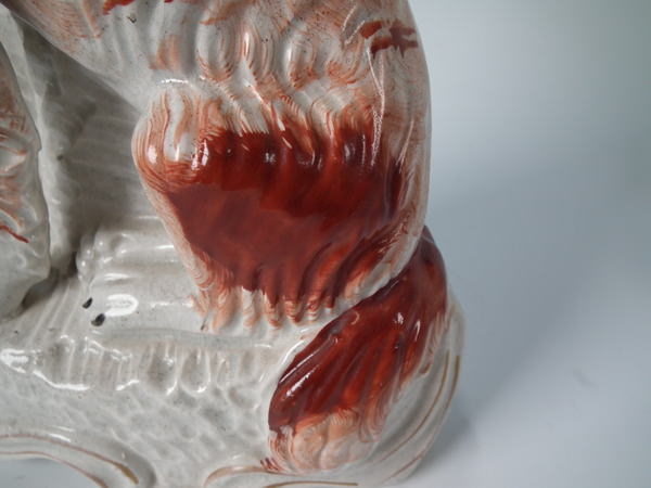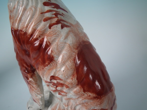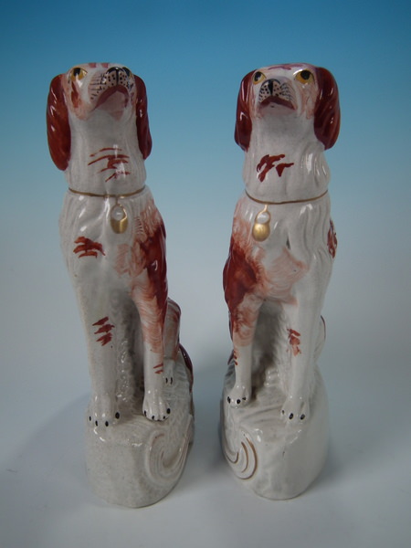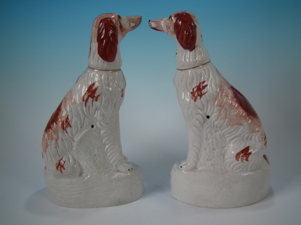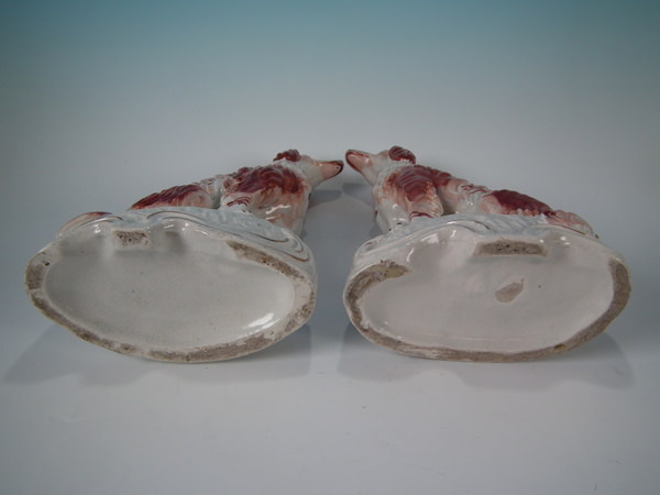 Victorian, circa 1860. Tallest is 12ins high, 7.9ins wide, 3.7ins depth. Pair of Staffordshire figures which feature an Irish Setter, seated on a scroll work base.
