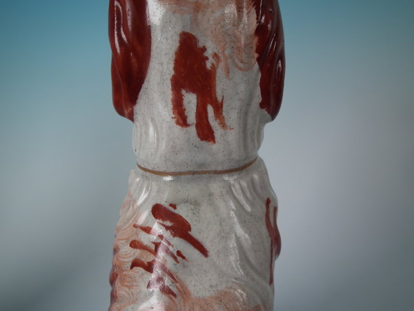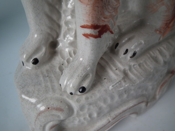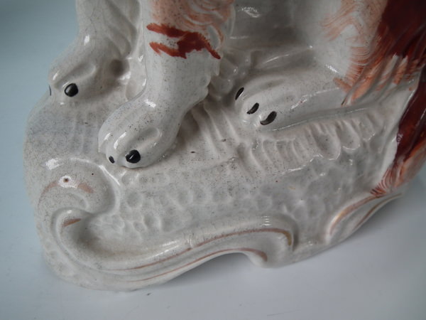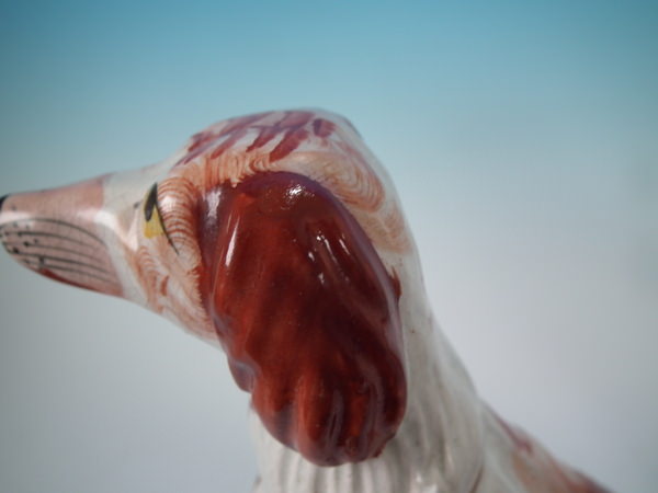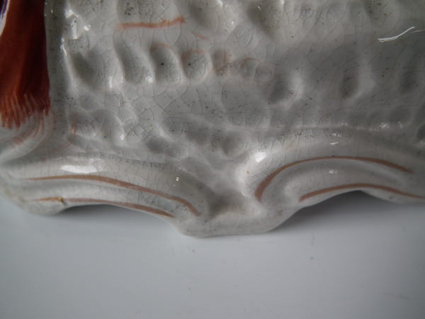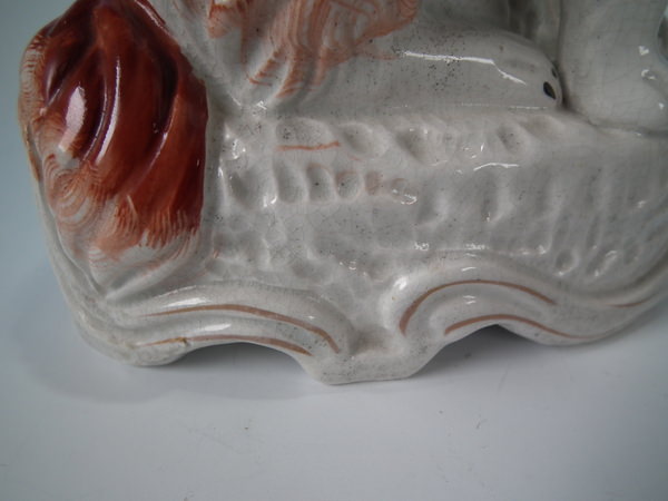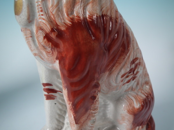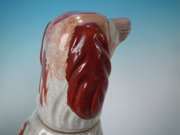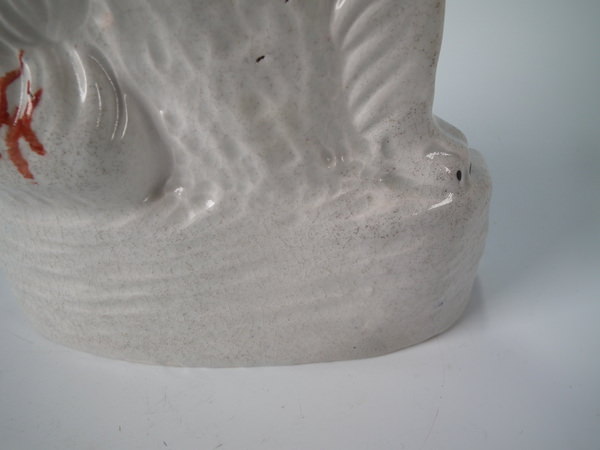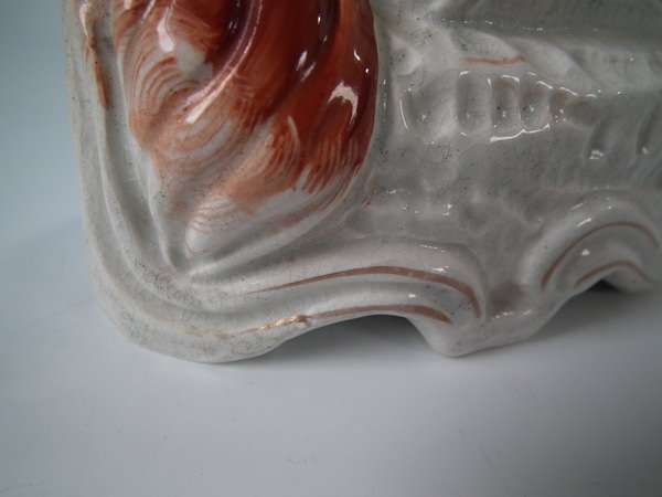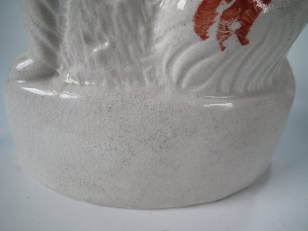 Victorian, circa 1860. Tallest is 12ins high, 7.9ins wide, 3.7ins depth. Pair of Staffordshire figures which feature an Irish Setter, seated on a scroll work base.
