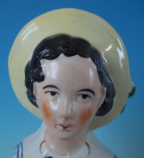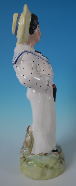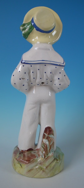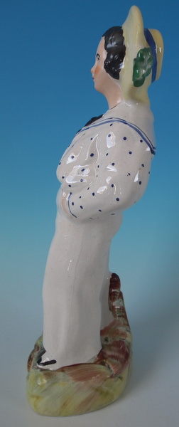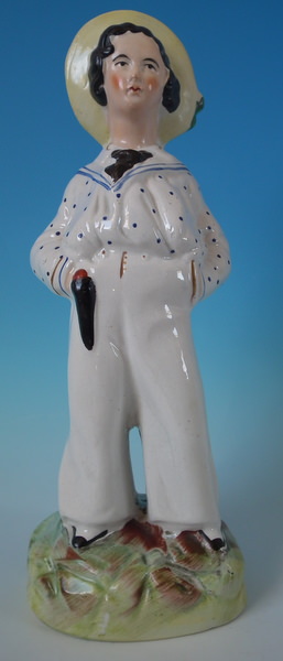 Victorian, circa 1870. 12ins high, 4.3ins wide, 3.7ins depth. Staffordshire figure with a maritime theme which features the Prince of Wales, dressed in a sailor outfit, stood on a shaped base. Multi-coloured version. Dull gilt embellishment.
