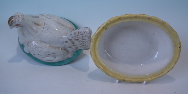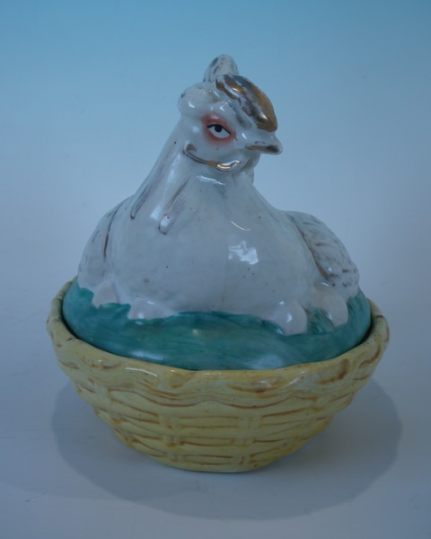 Staffordshire egg tureen and cover which features a hen sitting with her eggs, seated on a basketweave oval base.