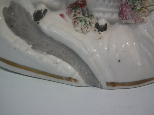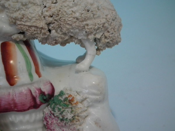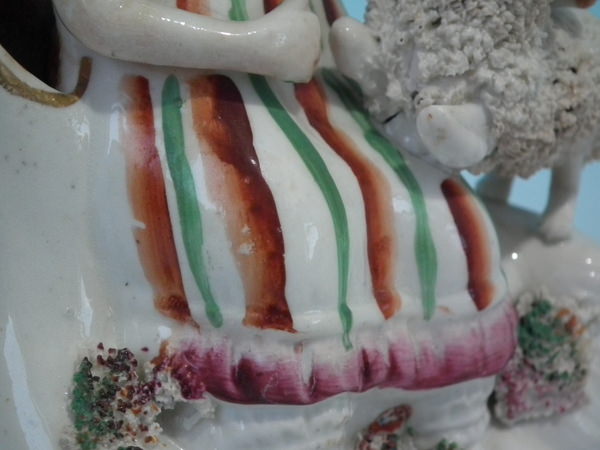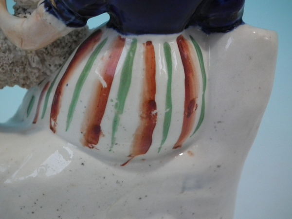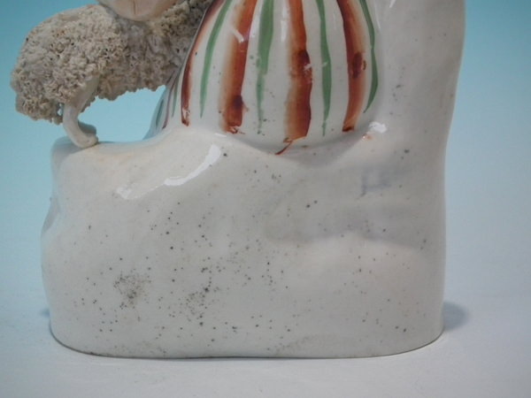 Staffordshire spill vase with a pastoral theme which features a lady with a sheep, seated on an oval hollow base.