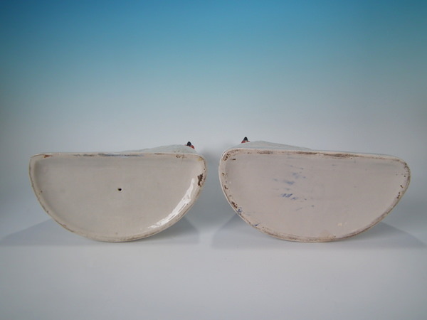 Victorian, circa 1880. Tallest is 12ins high, 9.7ins wide, 4.9ins depth. Pair of Staffordshire figures with a pastoral theme which feature cockerels/roosters, stood on a shaped base.