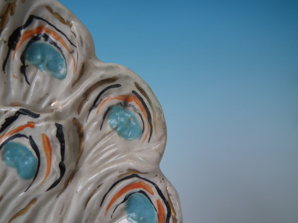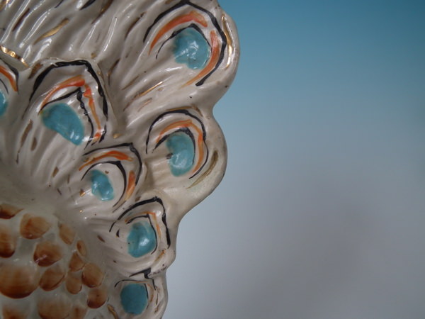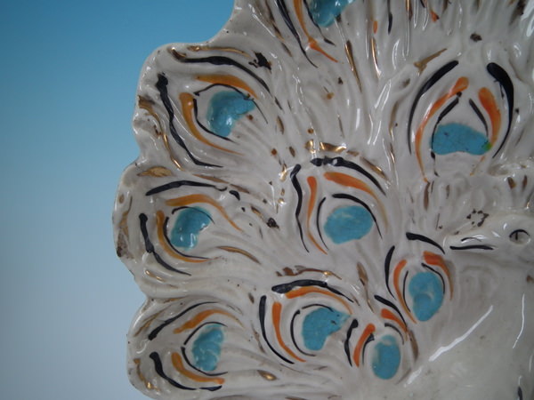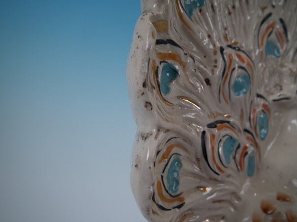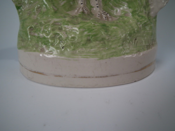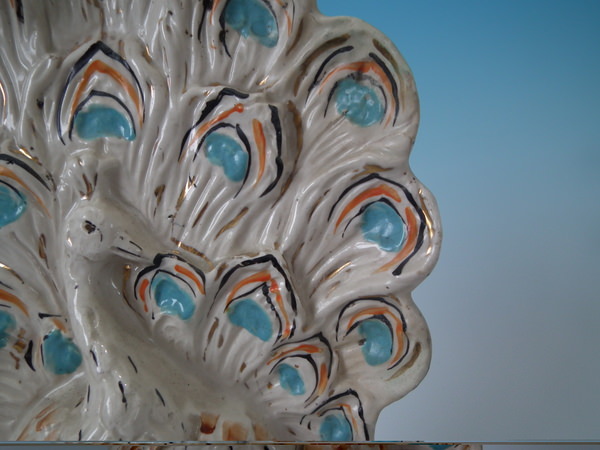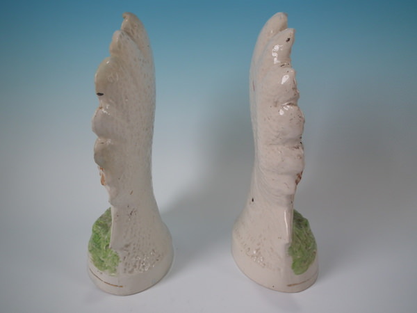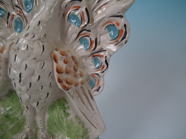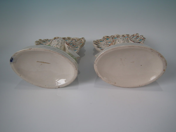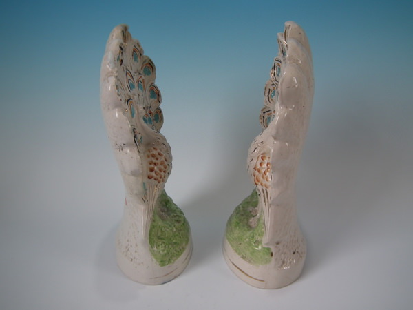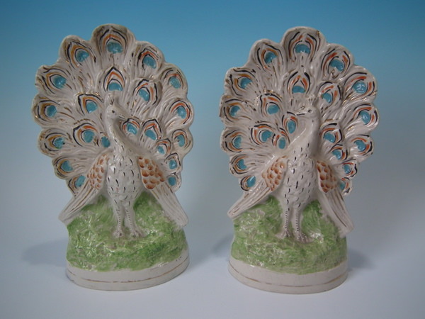 Victorian, circa 1900. Tallest is 11.2ins high, 5.9ins wide, 4.1ins depth. Pair of Staffordshire figures with a pastoral theme which feature peacocks, stood on an oval base.