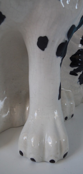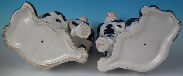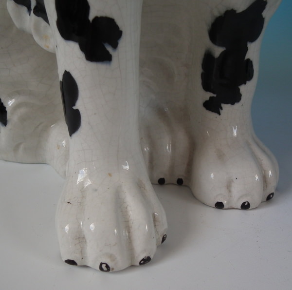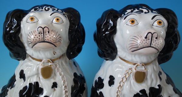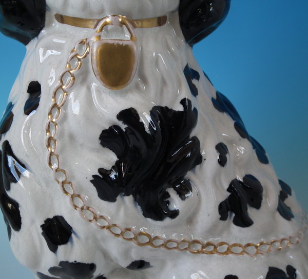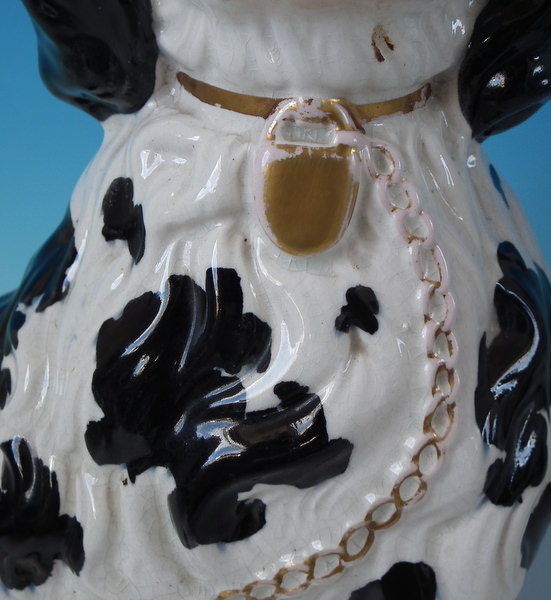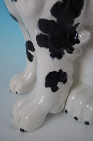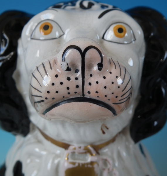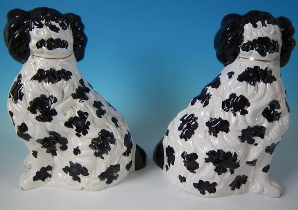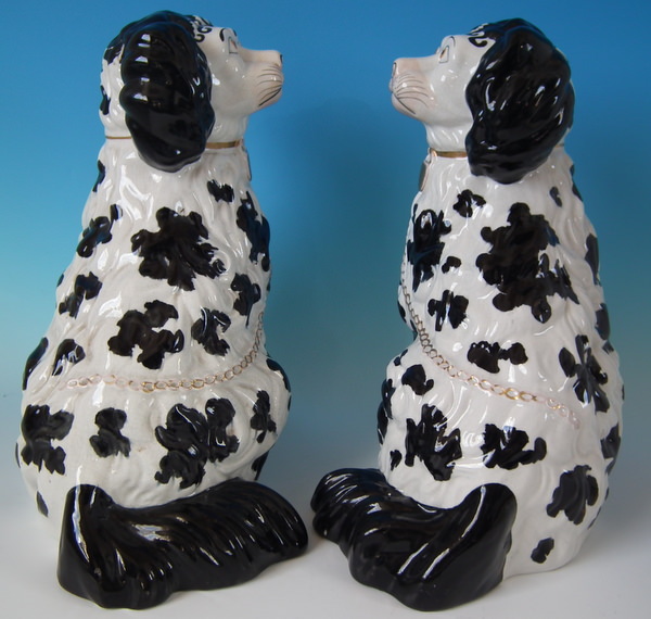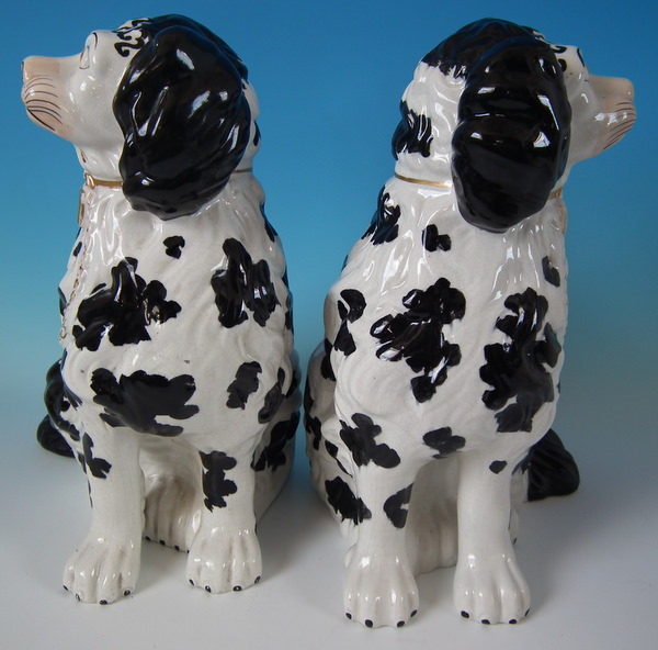 Victorian, circa 1860. Tallest is 12.2ins high, 10.1ins wide, 7.5ins depth. Pair of Staffordshire figures which feature a 'chunky' spaniel with Disraeli curls to head, front leg free, seated directly on the ground, no base. Black and white version. Dull gilt collar and locket.