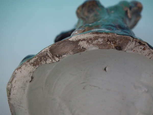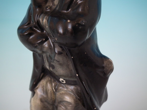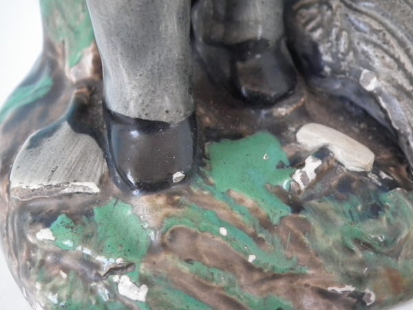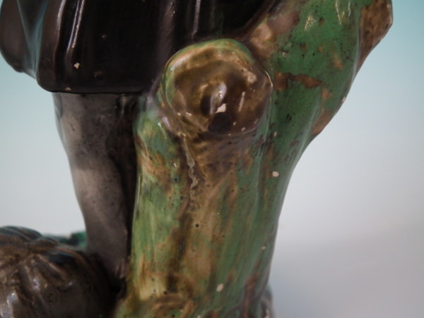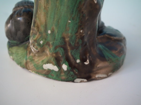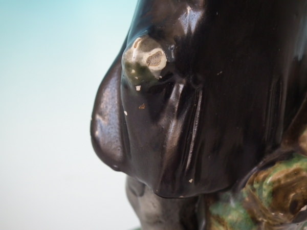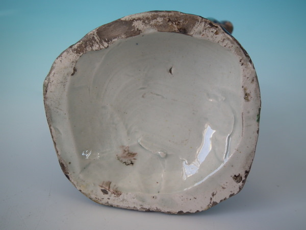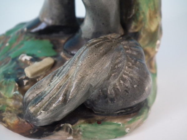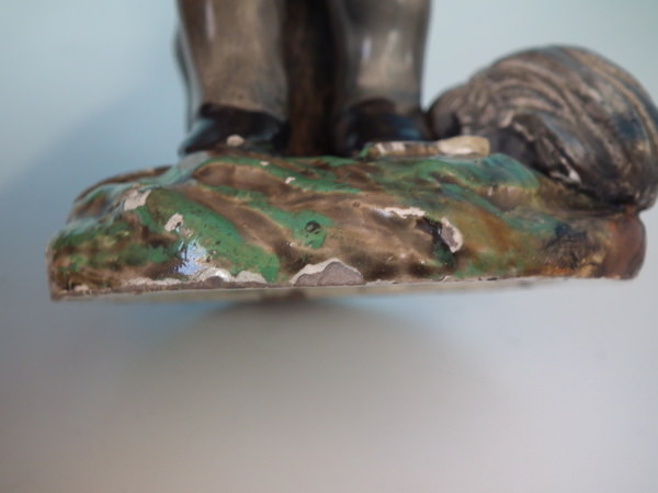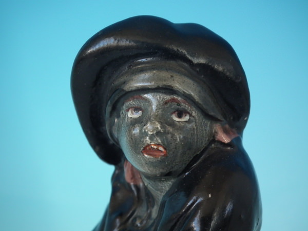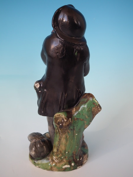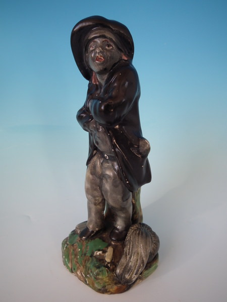 pre-Victorian, circa 1820. 7.1ins high, 3ins wide, 3.5ins depth. Staffordshire pearlware figure with a occupational theme which features a young chimney sweep, stood on a shaped base. Multi-coloured version. Decorated 'in the round' - decoration to front and reverse.