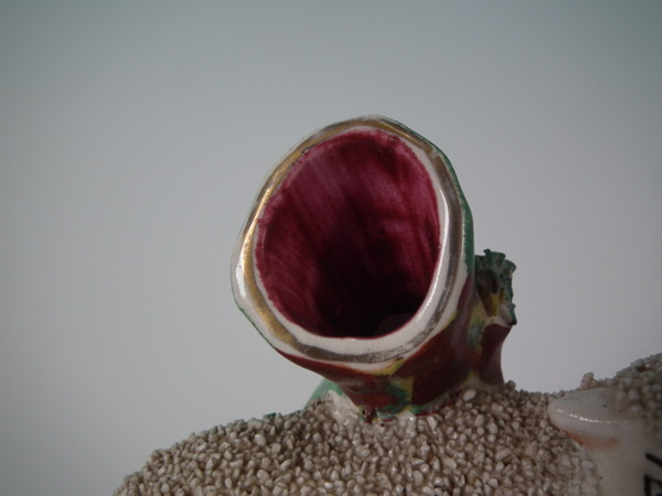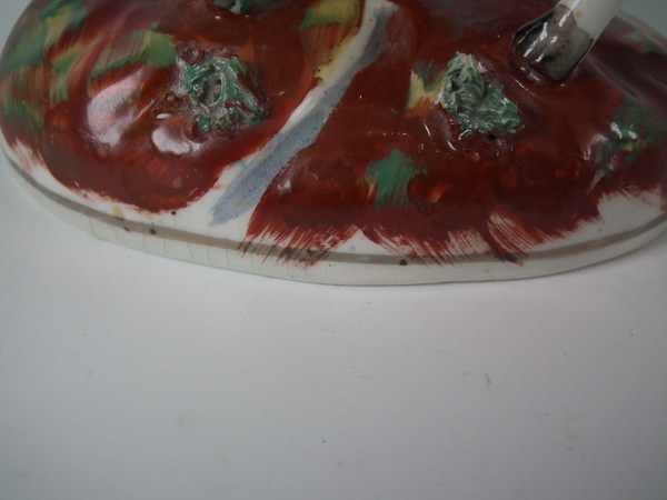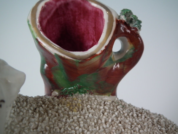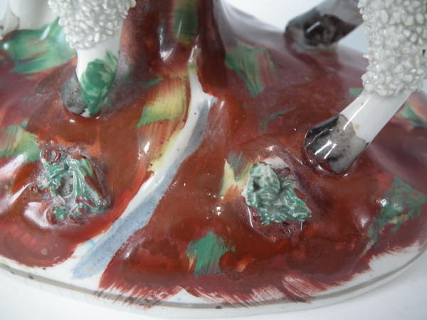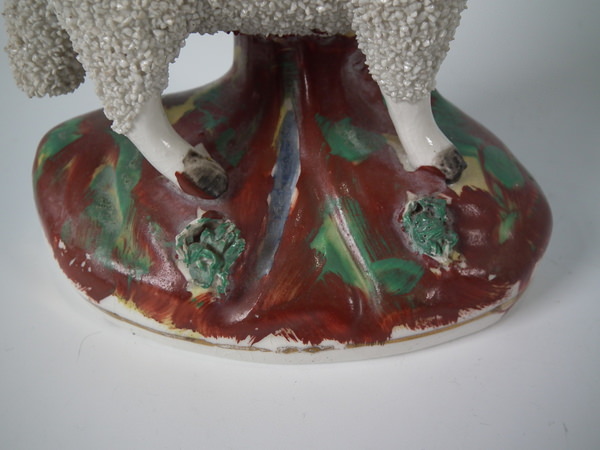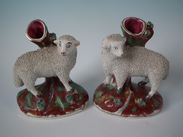 Victorian, circa 1890. Tallest is 5.1ins high, 4.2ins wide, 2.8ins depth. Pair of Kent Staffordshire spill vases which feature a ram and ewe in front of a tree stump, stood on an oval base.