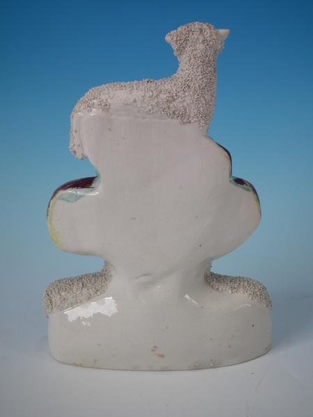 Victorian, circa 1860. 8.7ins high, 6.3ins wide, 2.4ins depth. Staffordshire clock group with a pastoral theme which features three sheep surrounding a clock, resting on an oblong base.