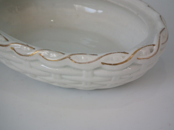 Staffordshire tureen with cover which features a hen on a basket, seated on an oval basketweave tureen base.