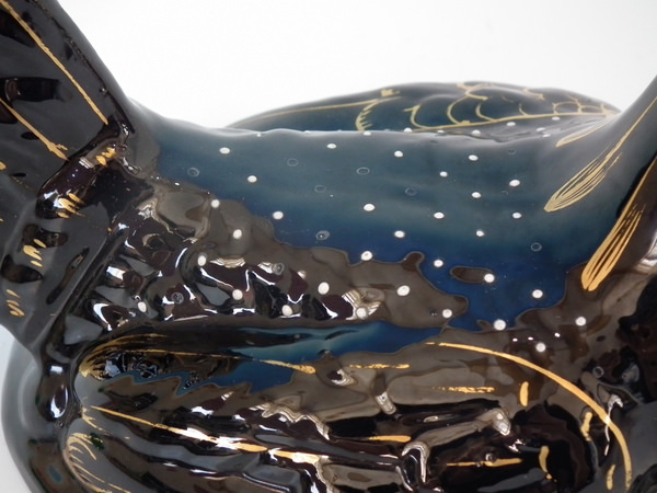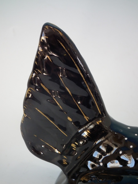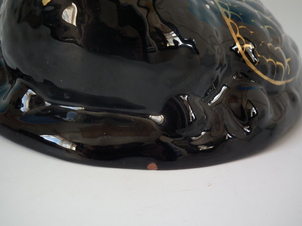 Jackfield black version. Dull gilt embellishment. Decorated 'in the round' - decoration to front and reverse.