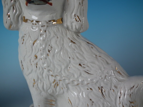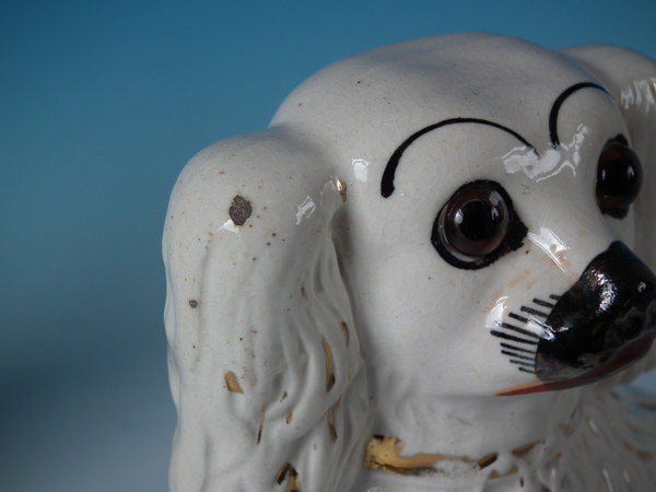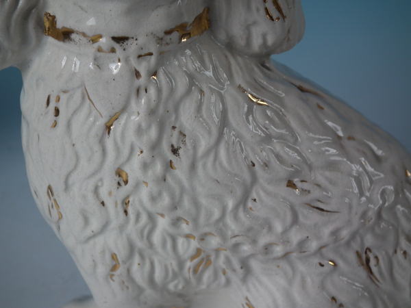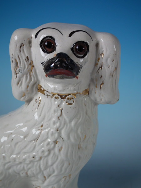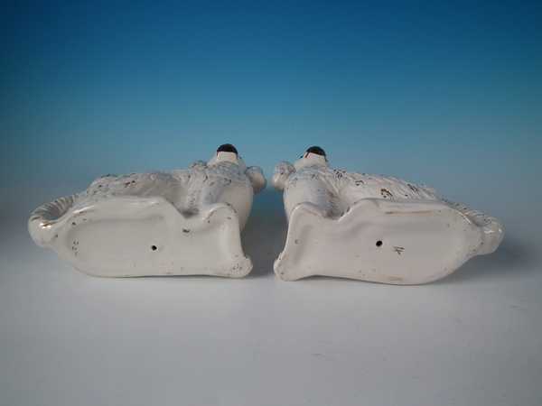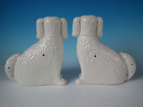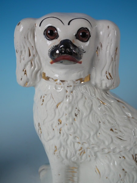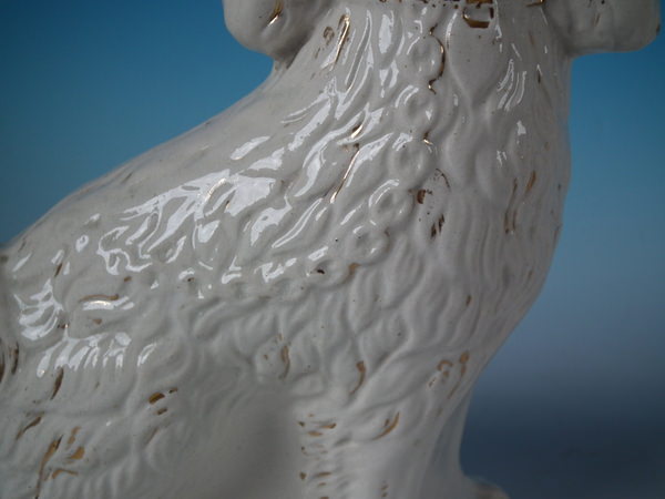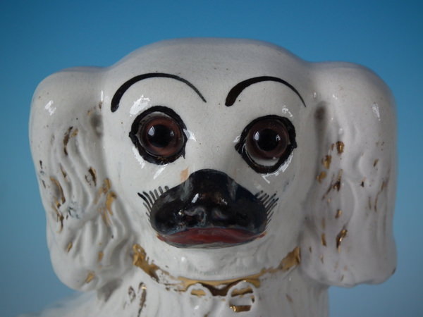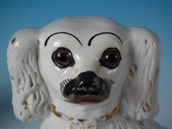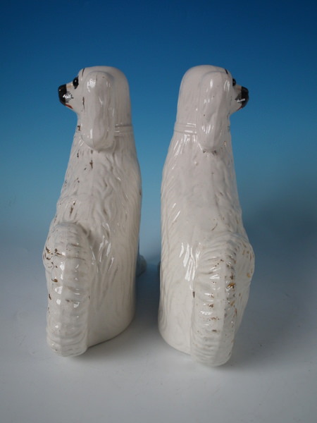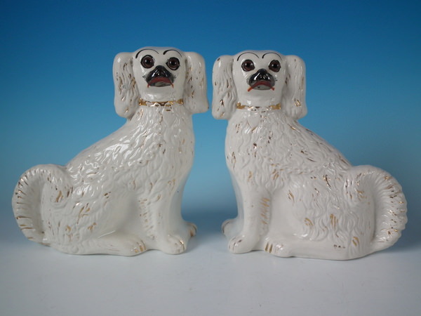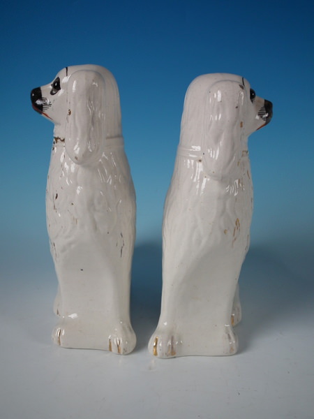 Pair Staffordshire white & gilt spaniels with glass eyes