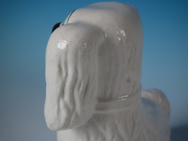 Victorian, circa 1890. Tallest is 8.7ins high, 7.7ins wide, 2.8ins depth. Pair of Staffordshire figures which feature a spaniel with glass eyes, seated directly on the ground, no base.