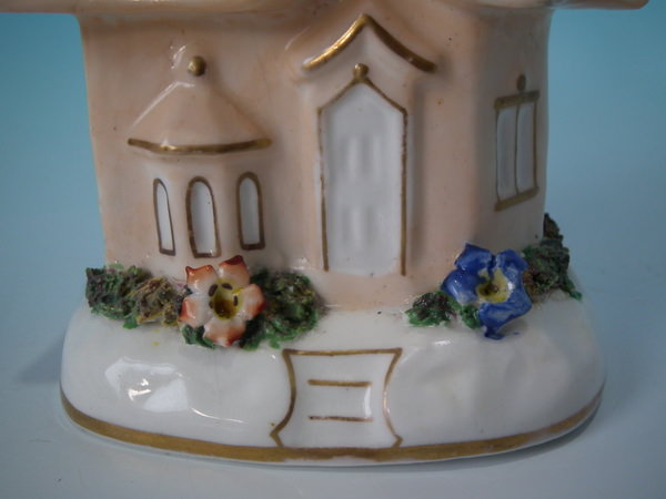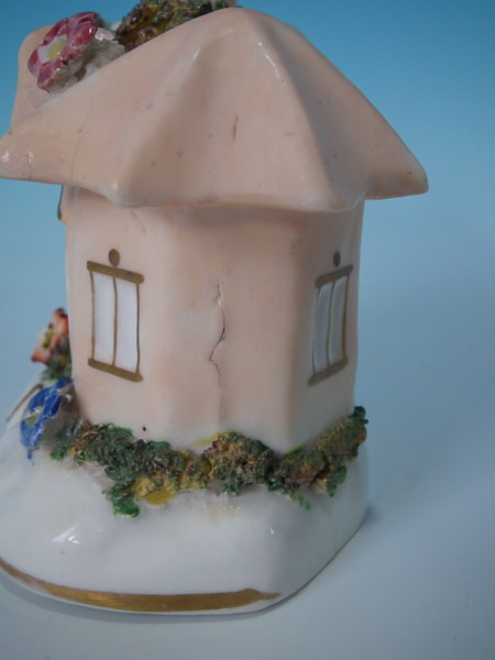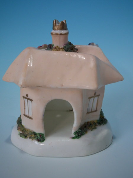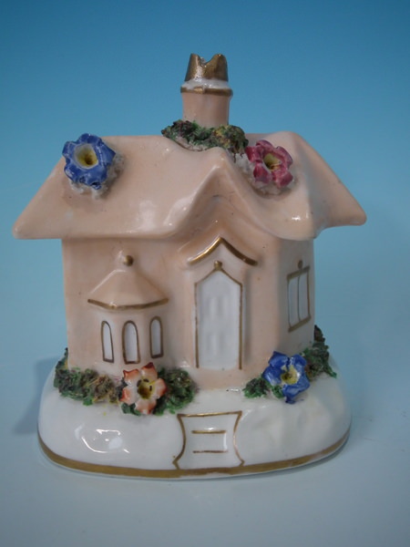 Victorian, circa 1860. 4.3ins high, 3.7ins wide, 2.8ins depth. Staffordshire pastille burner which features a cottage with flowers, stood on a shaped base. Salmon coloured version. Dull gilt base line and embellishment.