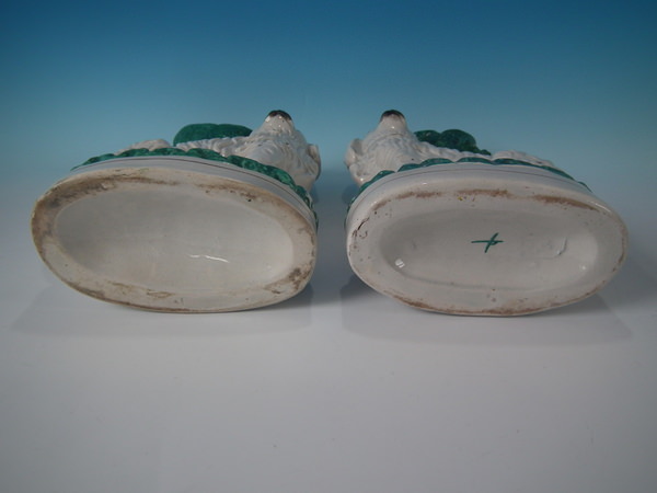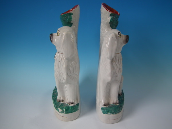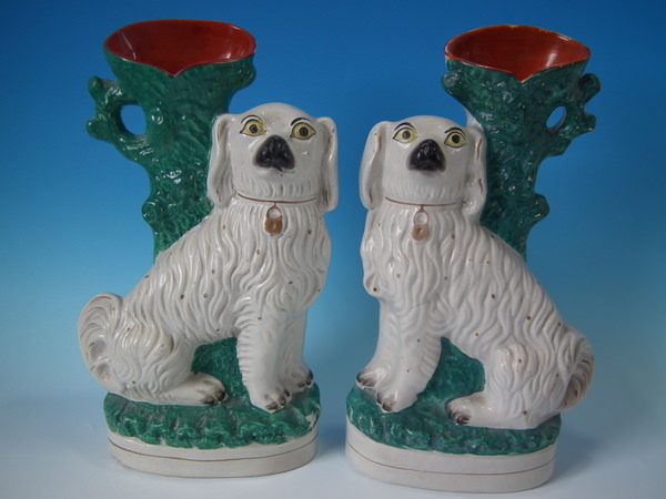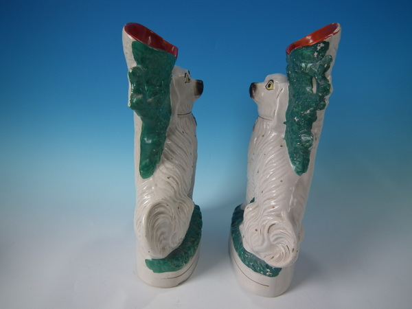 Victorian, circa 1860. Tallest is 13.5ins high, 7.5ins wide, 3.8ins depth. Pair of Staffordshire spill vases which feature a spaniel, seated on an oval base.