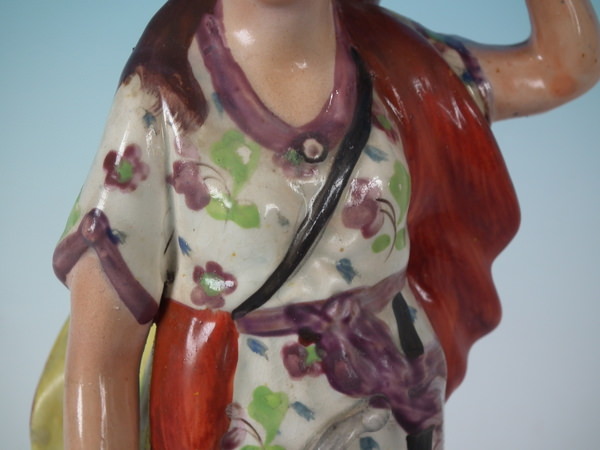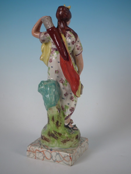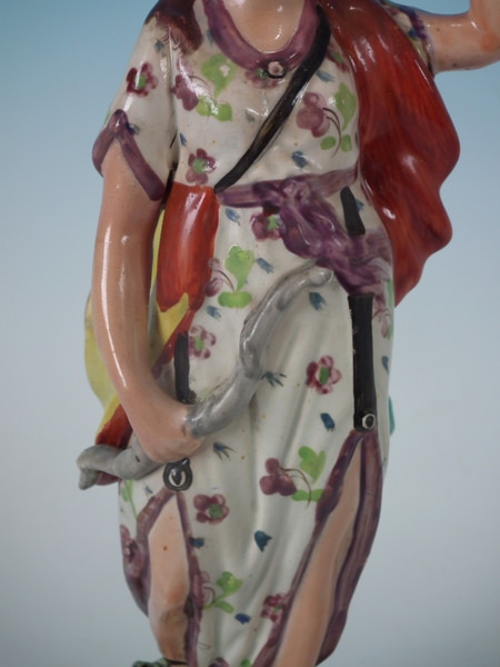 Staffordshire pearlware figure with a mythological theme which features Diana, pulling an arrow from her quiver, stood on a square base.