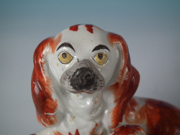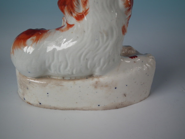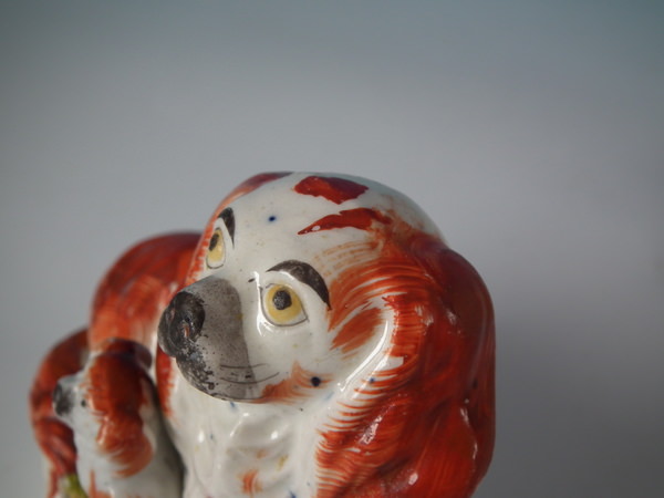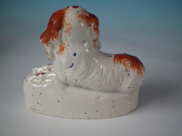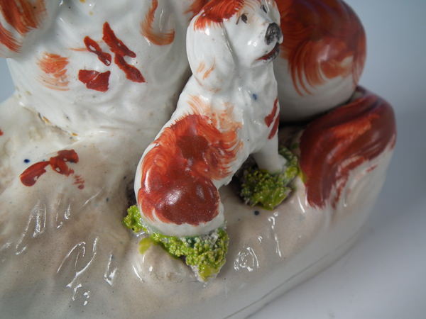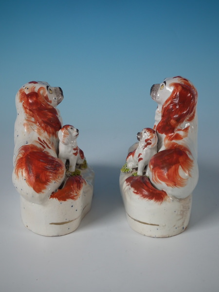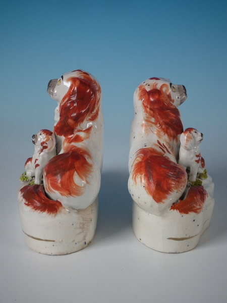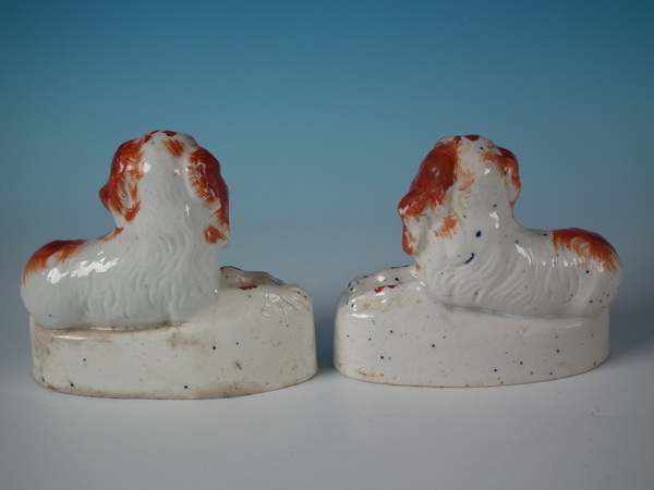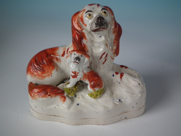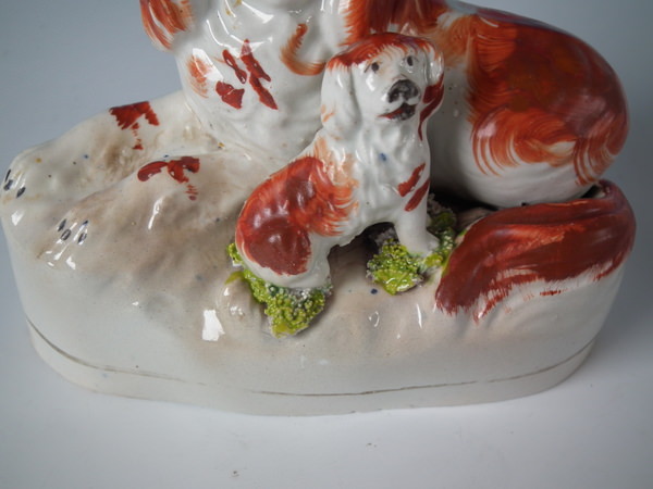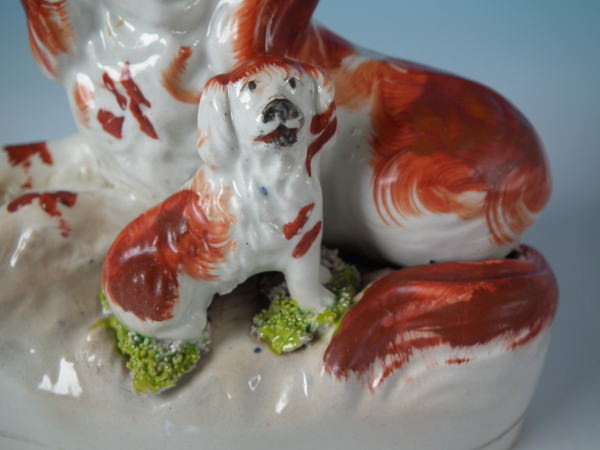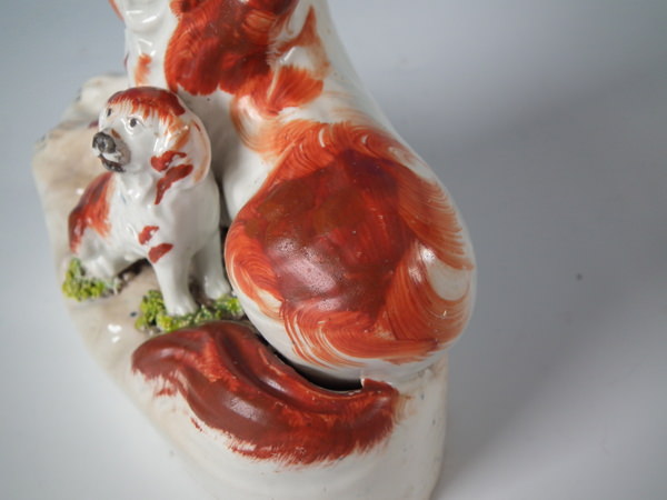 Victorian, circa 1850. Tallest is 4.6ins high, 5.2ins wide, 2.4ins depth. Pair of Staffordshire figures which feature a recumbent spaniel, with her pup seated beside her,