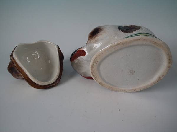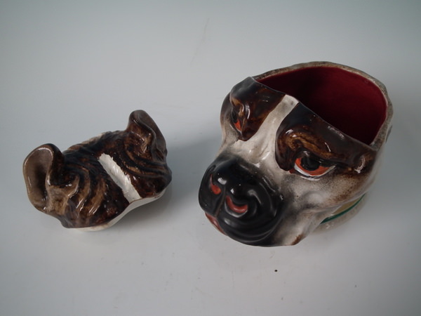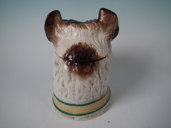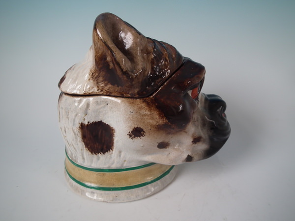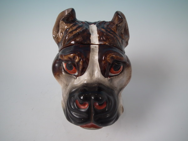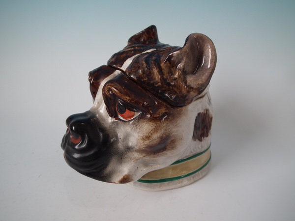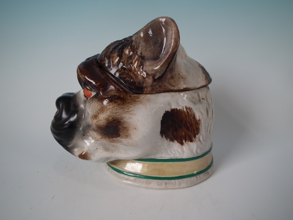 Victorian, circa 1860. 6.1ins high, 6.3ins wide, 4.3ins depth. Staffordshire tobacco jar and cover which features an American pit bull terrier head, resting on a circular base.
