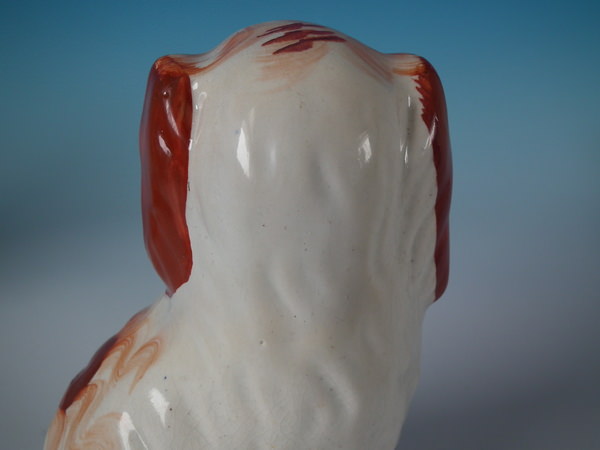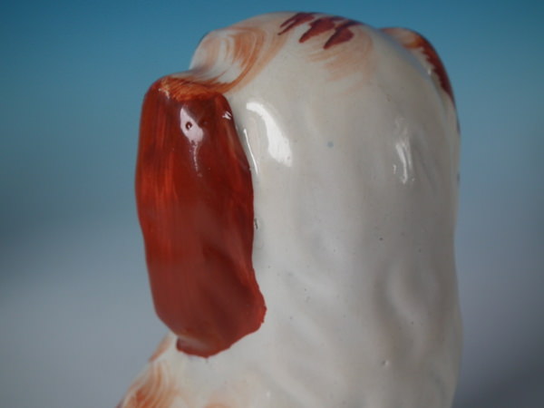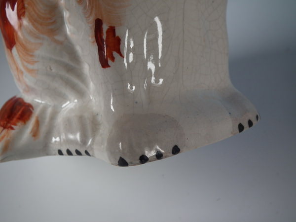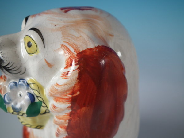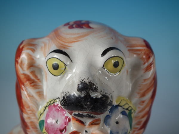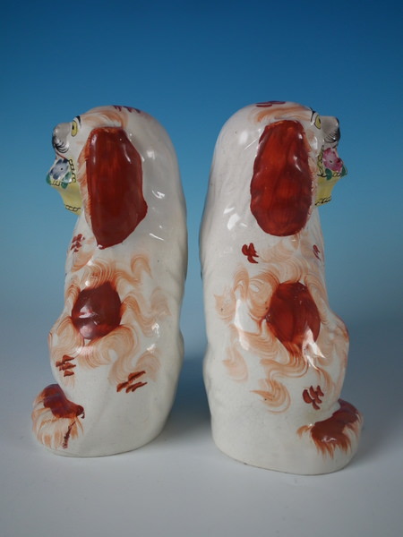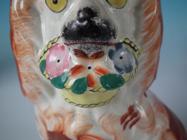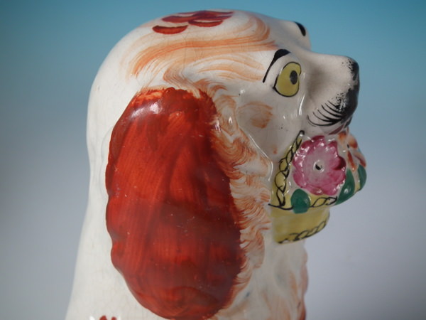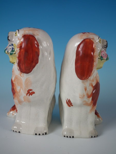 Victorian, circa 1860. Tallest is 7.9ins high, 4.9ins wide, 3.5ins depth. Pair of Staffordshire figures which feature a spaniel holding a basket of flowers in it's mouth,