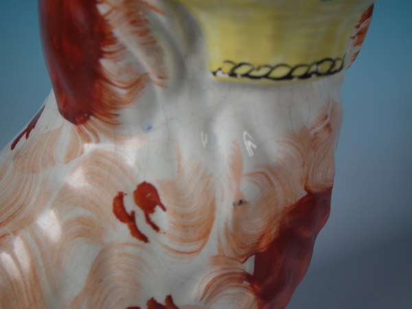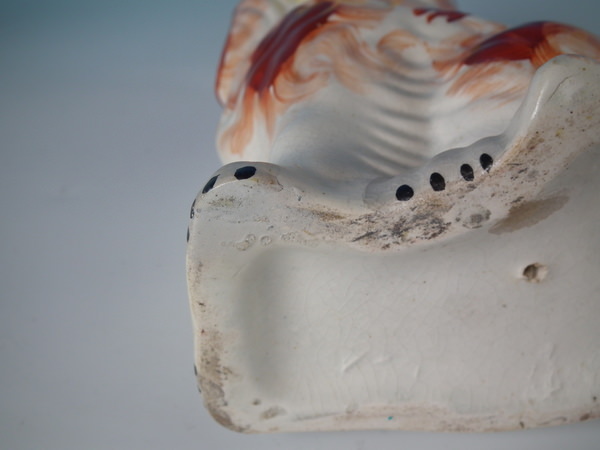 Filled chip to front left paw.