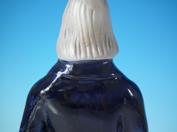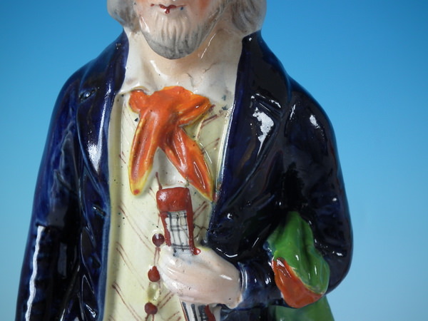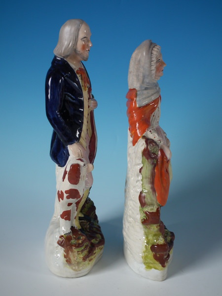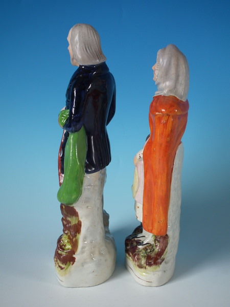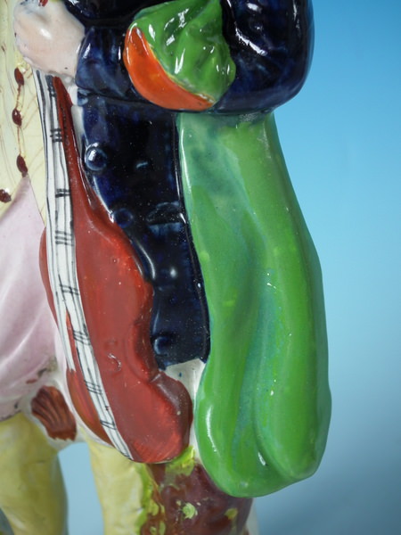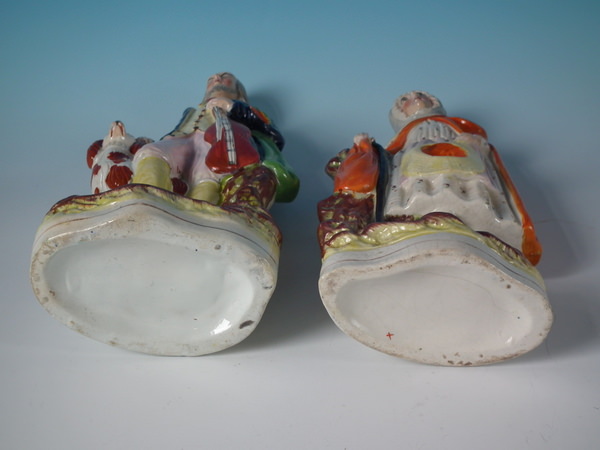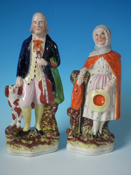 Victorian, circa 1860. Tallest is 11.6ins high, 4.9ins wide, 3ins depth. Pair of Staffordshire figures with a musical theme which feature a blind fiddler and an old lady, stood on a shaped base.