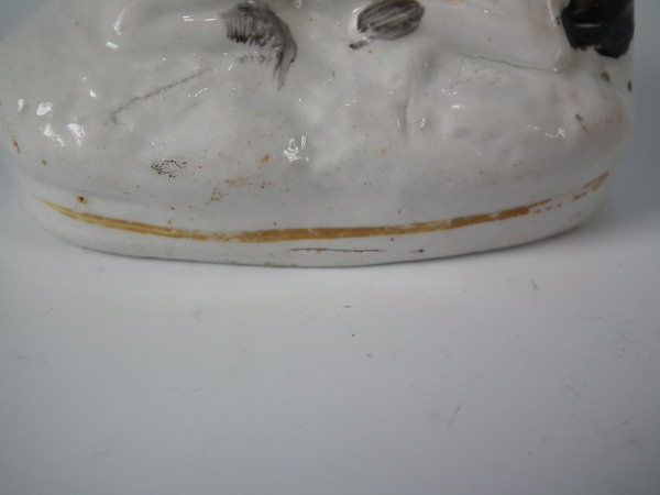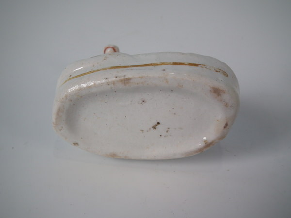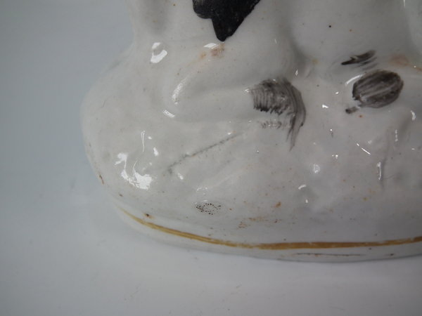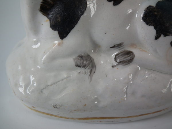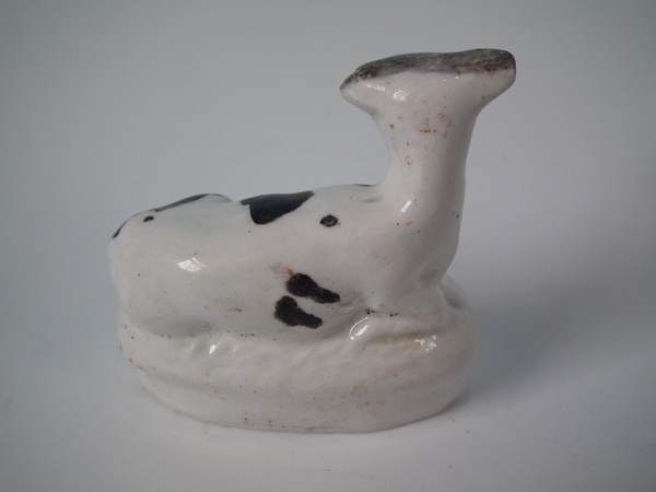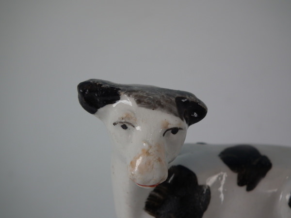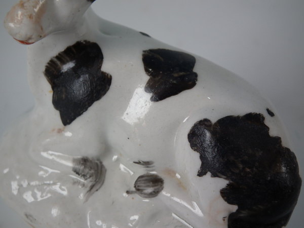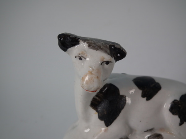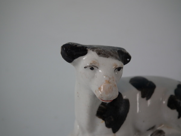 Victorian, circa 1860. 2.8ins high, 2.8ins wide, 1.7ins depth. Staffordshire figure which features a cow, recumbent on an oval base. Black and white version.