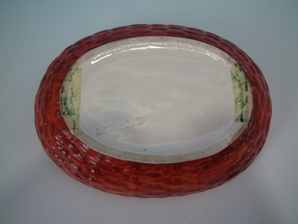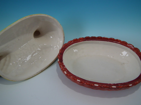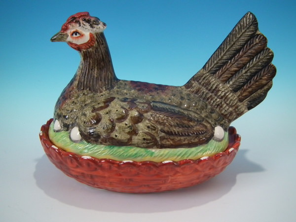 Edwardian, circa 1910. 9.6ins high, 12.6ins wide, 8.4ins depth. Kent Staffordshire egg tureen and cover which features a hen sitting with her eggs, resting on a basketweave oval base. Multi-coloured version.