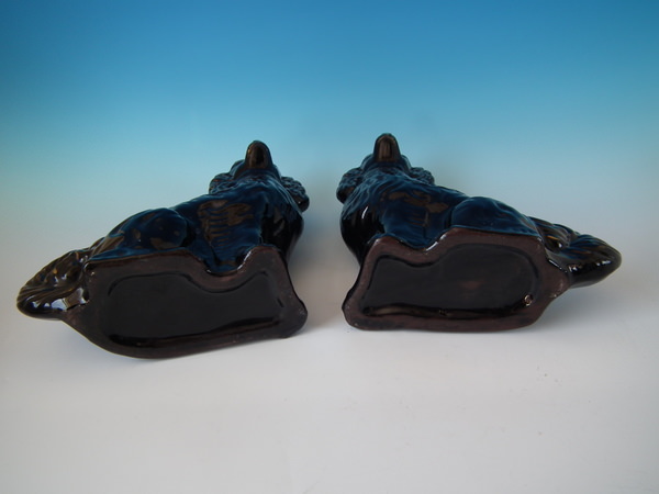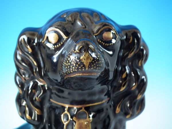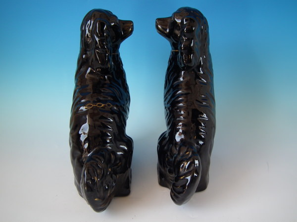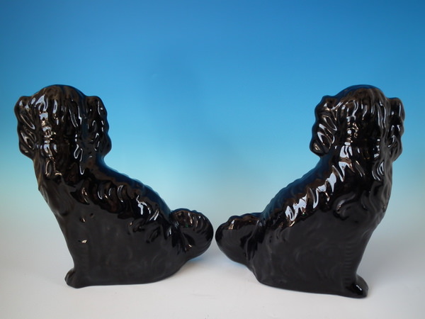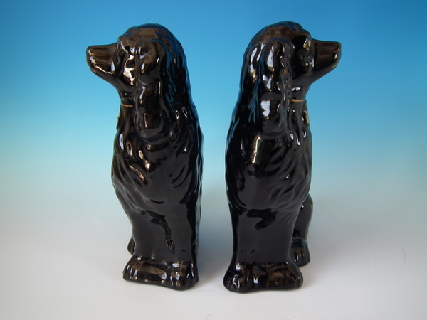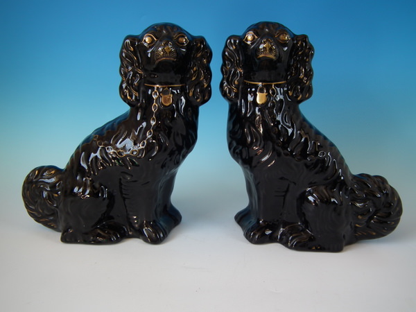 Victorian, circa 1880. Tallest is 11.8ins high, 9.1ins wide, 3.9ins depth. Pair of Staffordshire figures which feature a spaniel, seated directly on the ground, no base.