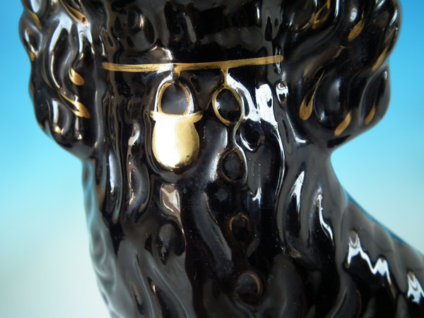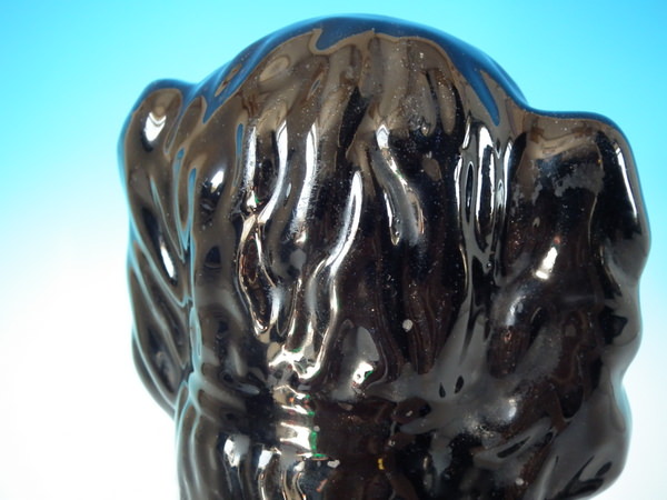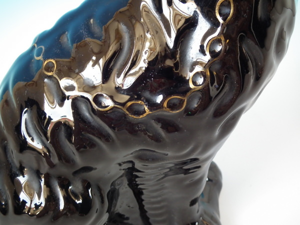 Jackfield black version. Dull gilt embellishment. Decorated 'in the round' - decoration to front and reverse.