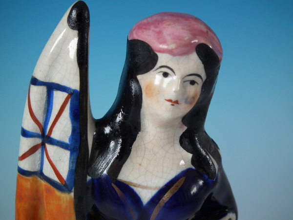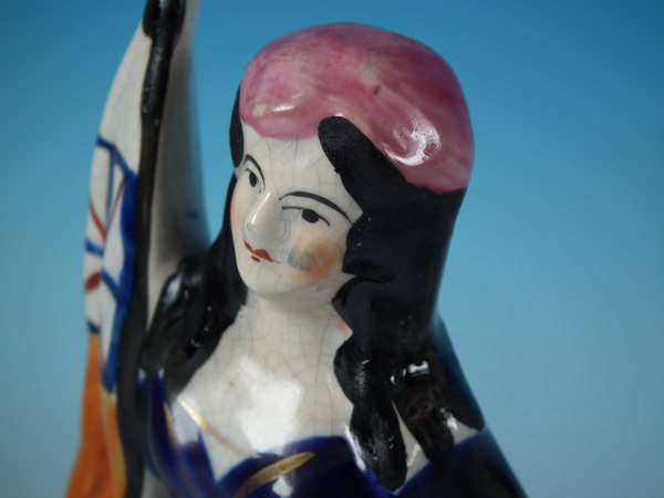 Victorian, circa 1860. Tallest is 8.7ins high, 3.5ins wide, 2.6ins depth. Pair of Staffordshire figures with a military theme which feature a sailor and a girl each holding a flag, stood on a circular base.