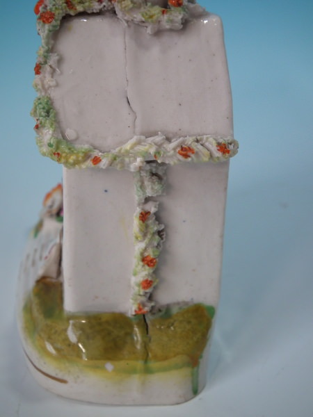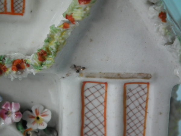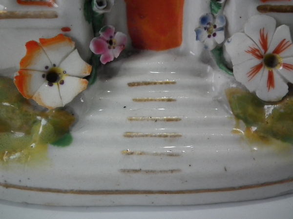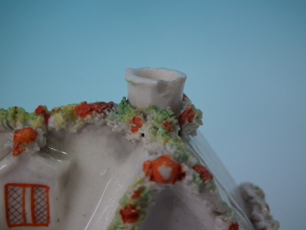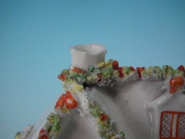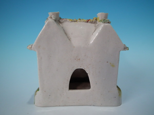 Victorian, circa 1860. 4.1ins high, 4.3ins wide, 2ins depth. Staffordshire pastille burner which features a cottage with flowers, stood on a shaped base. Multi-coloured version. Dull gilt base line and embellishment.