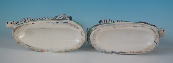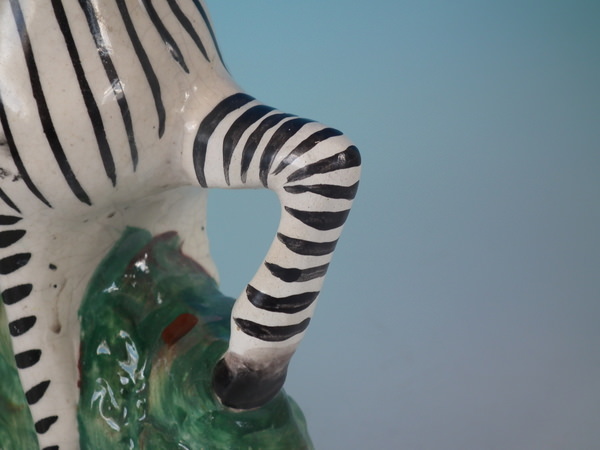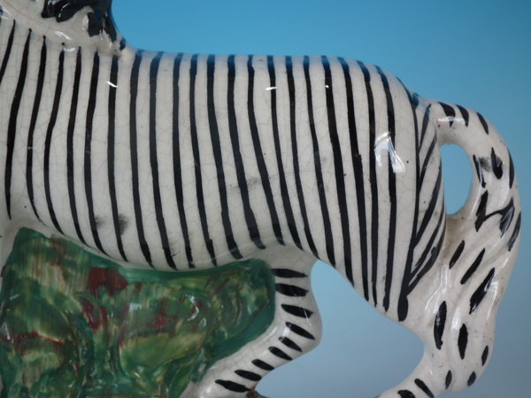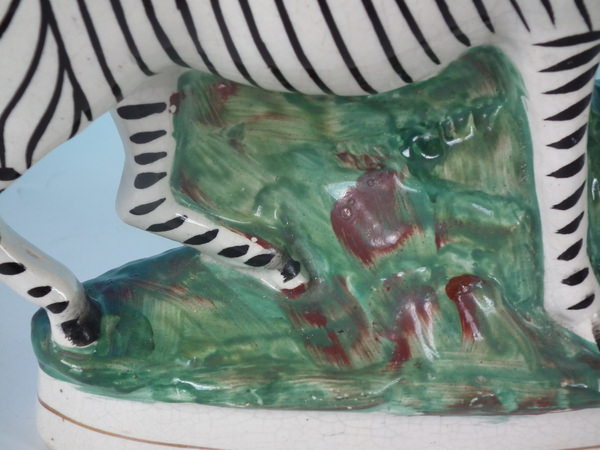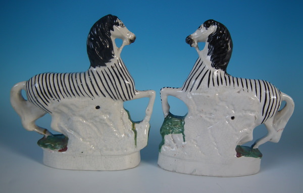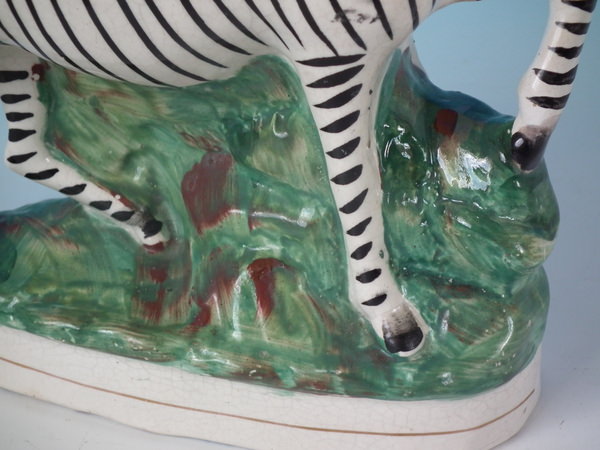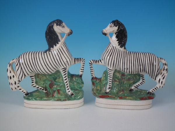 Pair of Staffordshire figures which feature a zebra, prancing on an oval base.