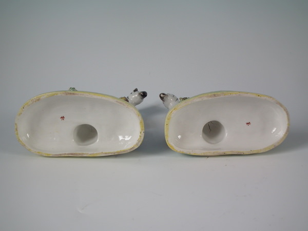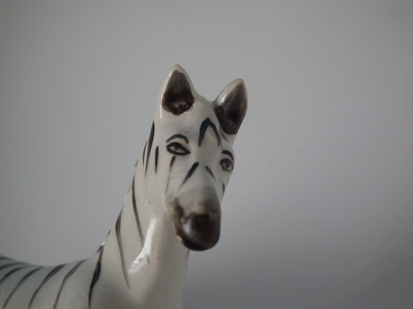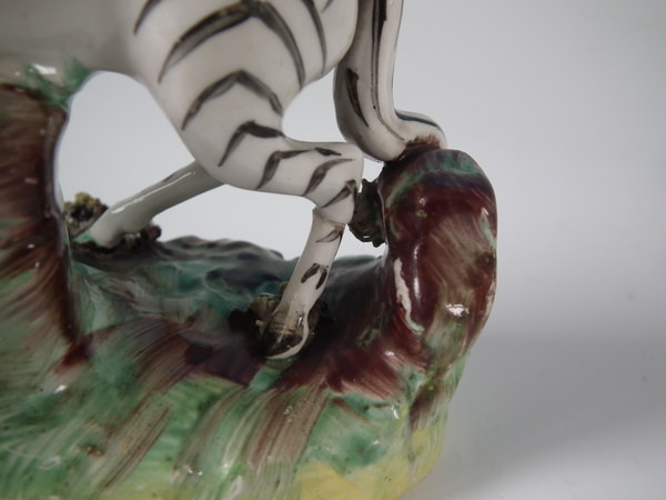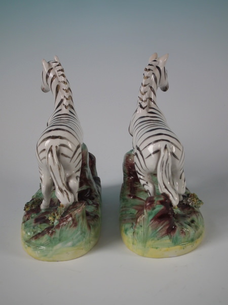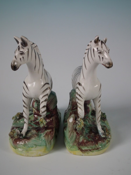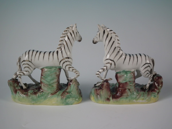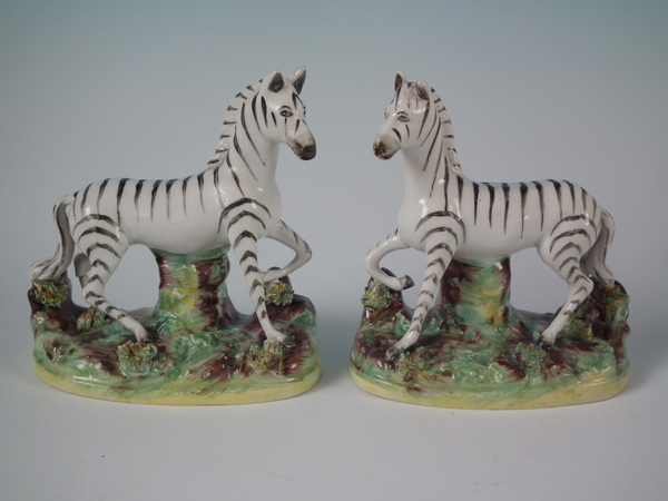 Victorian, circa 1880. Tallest is 4.7ins high, 4.6ins wide, 2.3ins depth. Pair of Staffordshire figures which feature a zebra, prancing on an oval base.