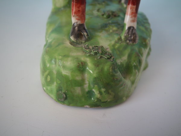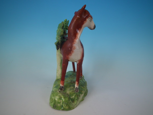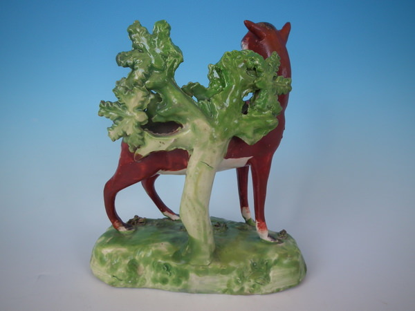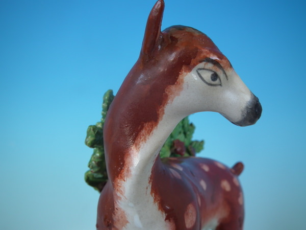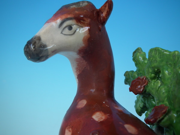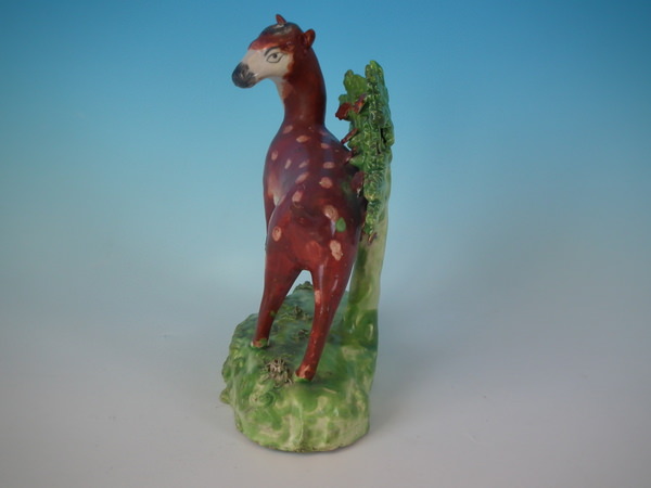 pre-Victorian, circa 1820. 7.3ins high, 6.5ins wide, 3.1ins depth. Staffordshire pearlware bocage figure which features a deer, stood on a shaped base.