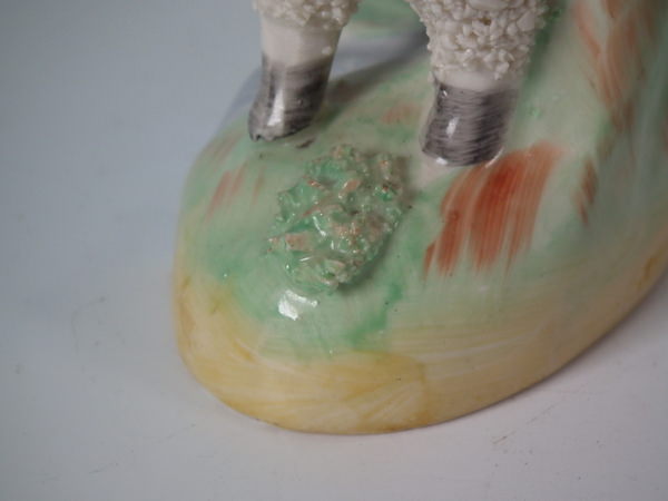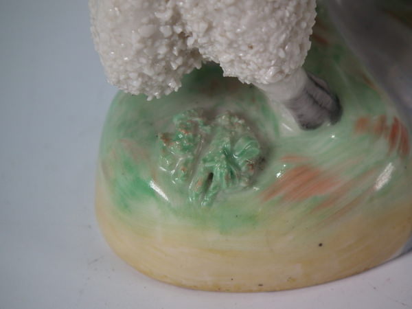 Pair of Kent Staffordshire spill vases with a pastoral theme which feature a ram and a ewe, stood on an oval base.