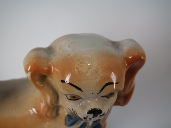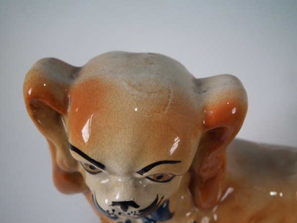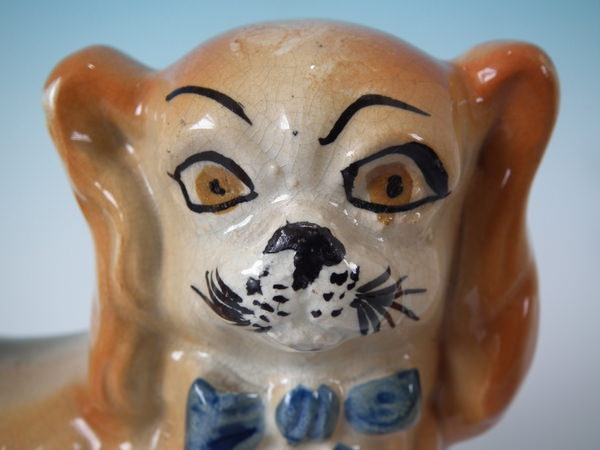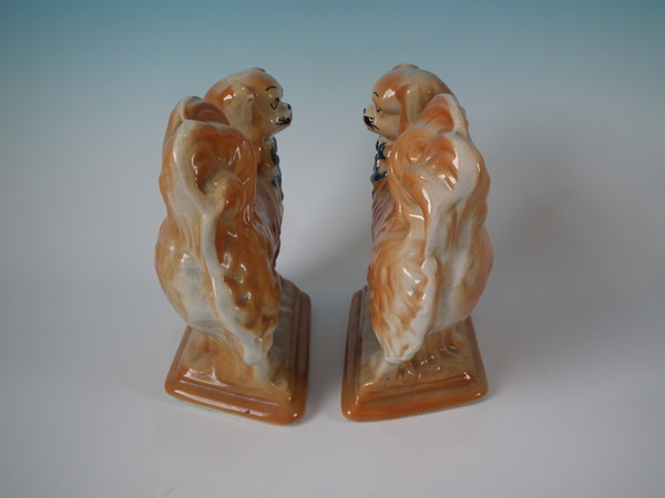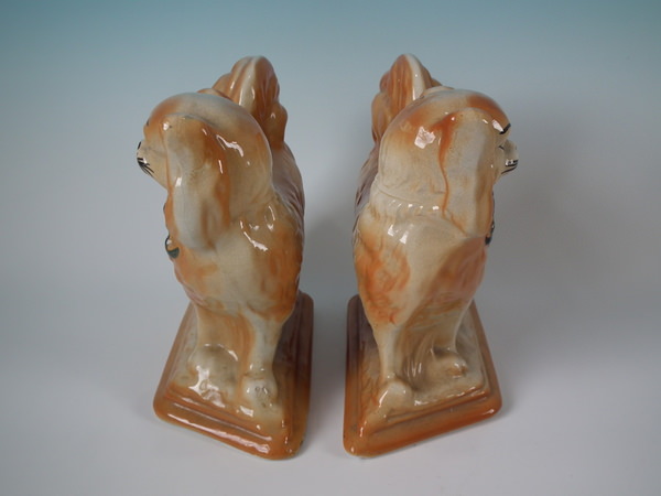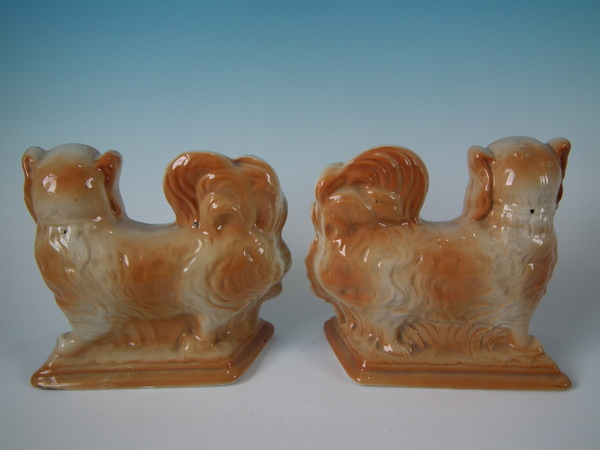 Edwardian, circa 1910. Tallest is 7.1ins high, 8.3ins wide, 3.7ins depth. Pair of Bo'ness Staffordshire figures which feature Pekinese dogs with blue ribbons, stood on a shaped base. Tan version.