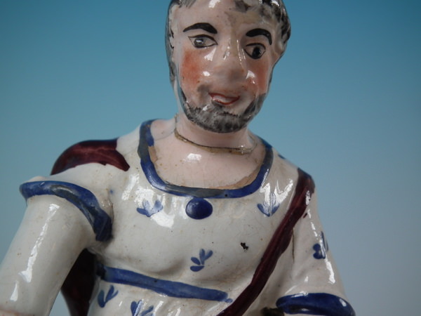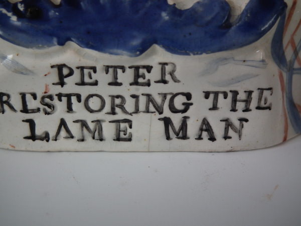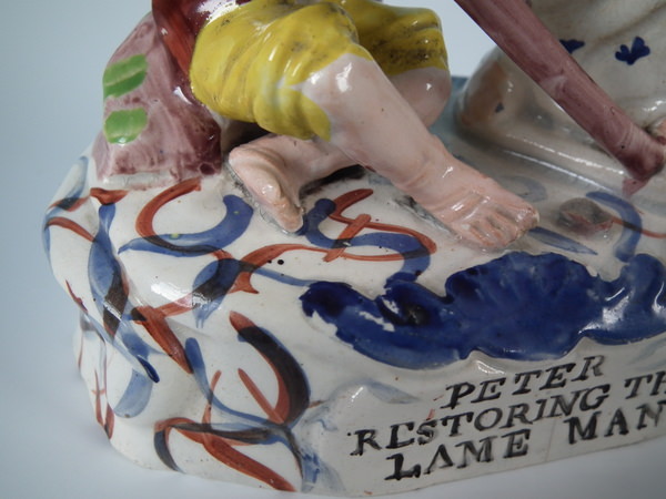 pre-Victorian, circa 1820. 6.6ins high, 4.7ins wide, 2.7ins depth. Staffordshire pearlware group with a religious theme which features Peter and a lame man, stood on a shaped hollow base.