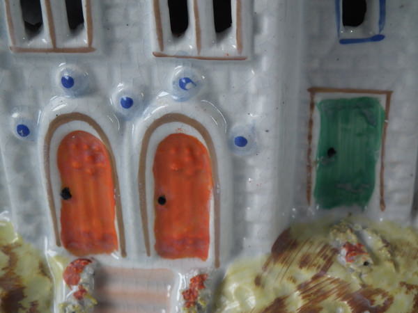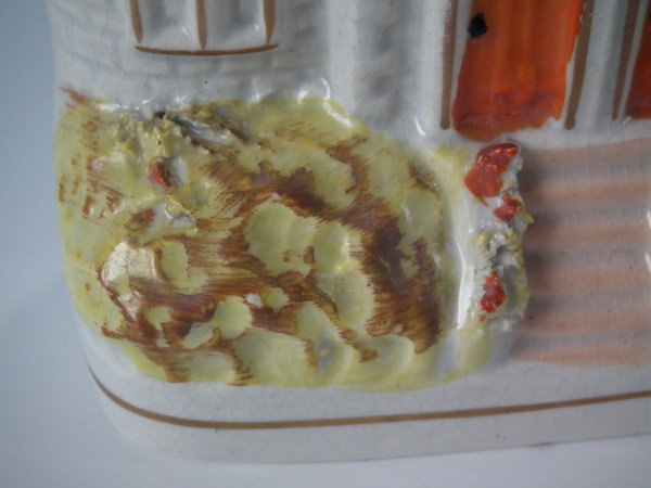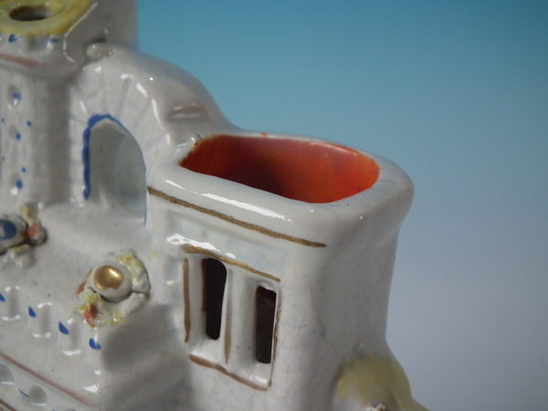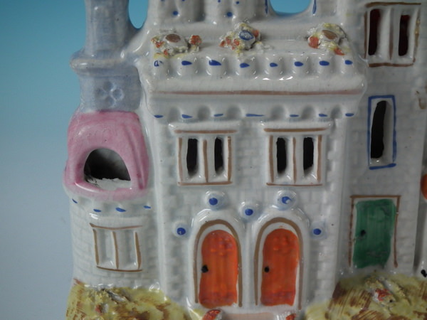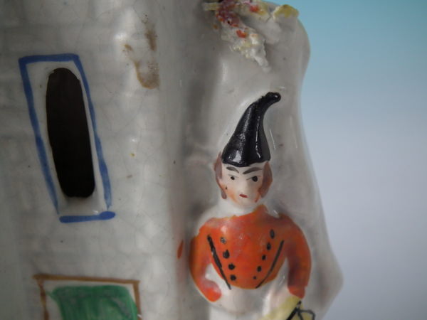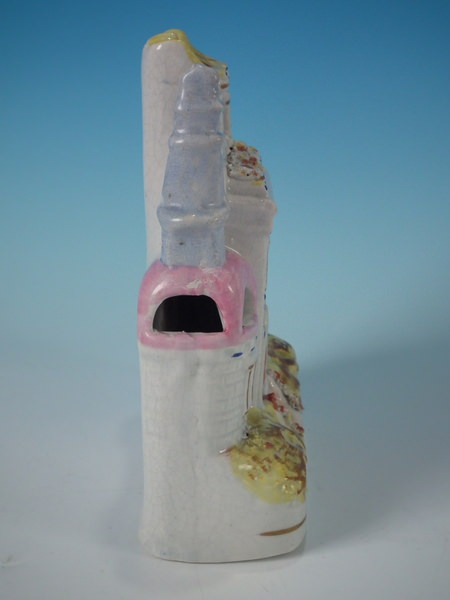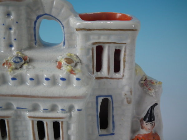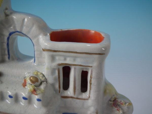 Victorian, circa 1860. 7.1ins high, 6.3ins wide, 2.6ins depth. Staffordshire castle which features a drummer boy, stood on a shaped base.