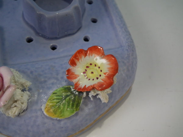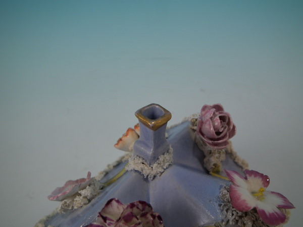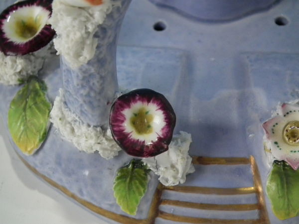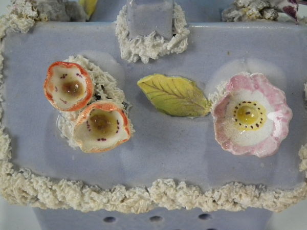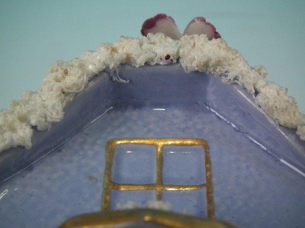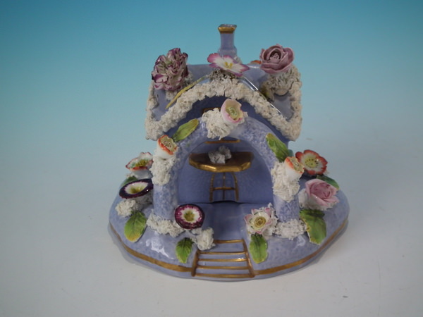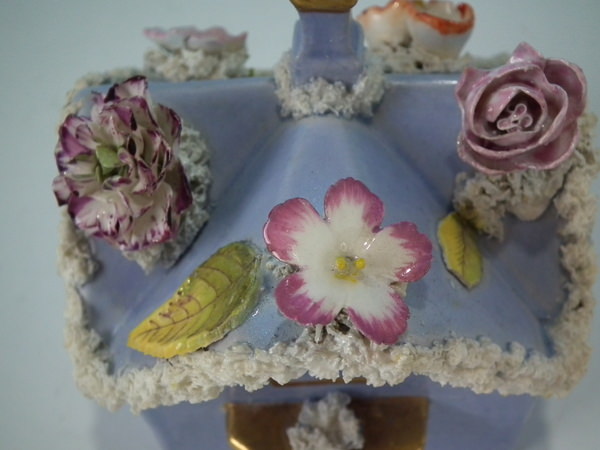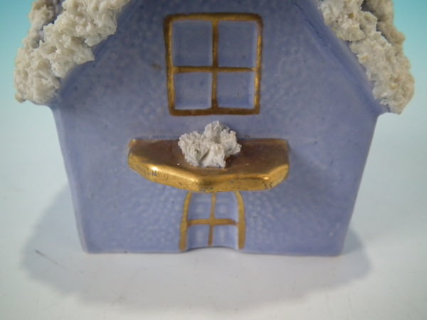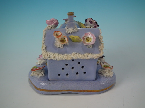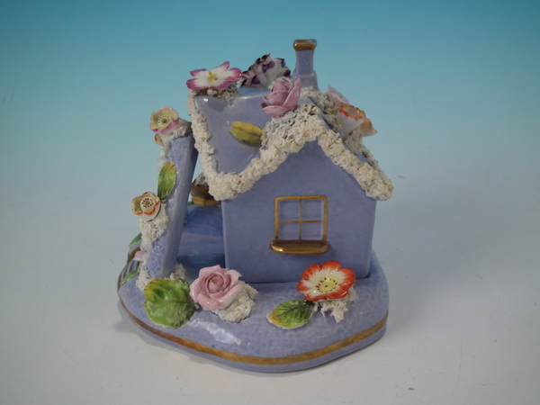 Victorian, circa 1860. 4.7ins high, 6.1ins wide, 5.1ins depth. Staffordshire pastille burner which features a two storey house embellished with flowers with an arbour at the entrance, stood on a separate base. Lilac version.