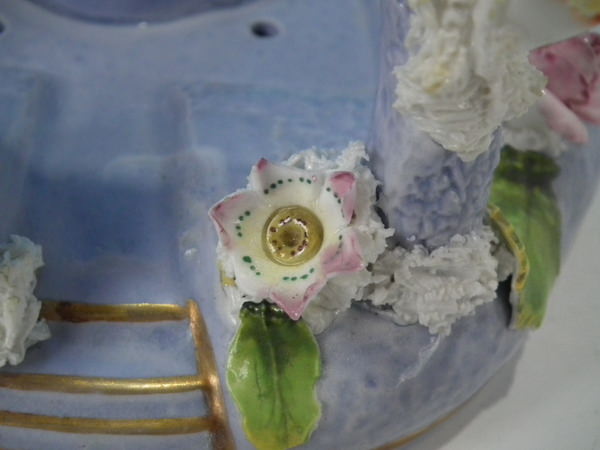 Dull gilt base line and embellishment. Decorated 'in the round' - decoration to front and reverse.