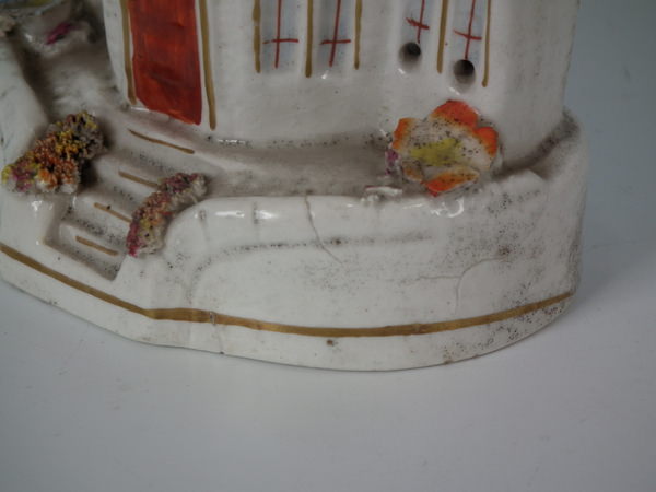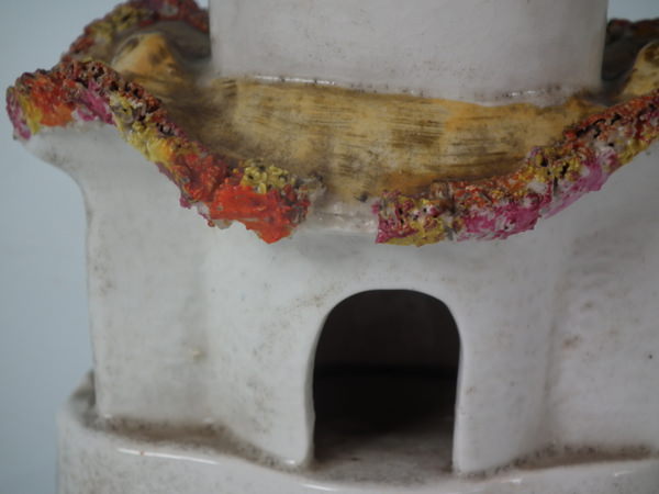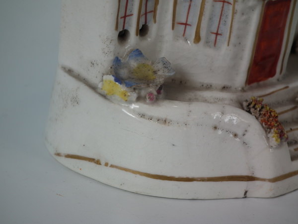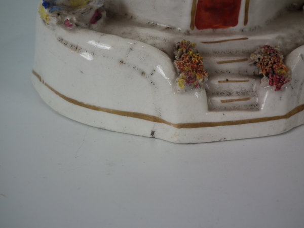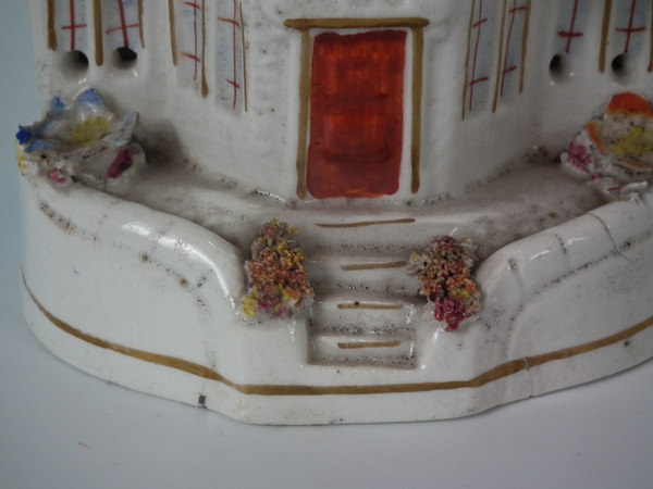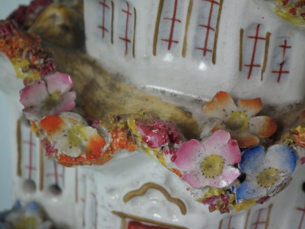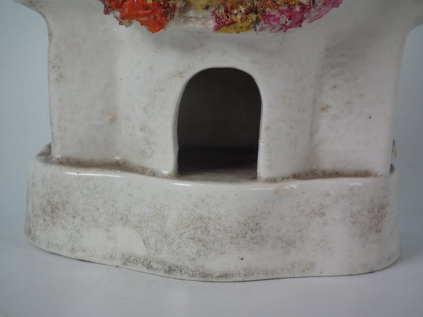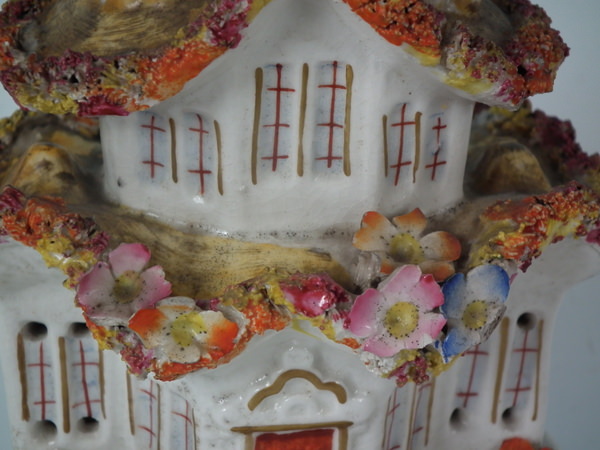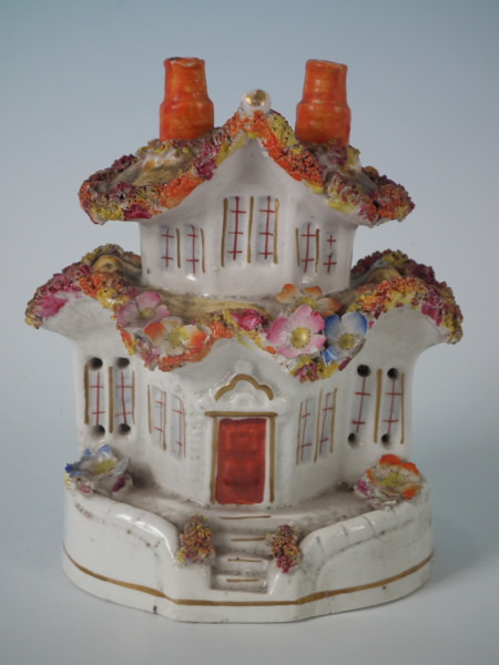 Staffordshire pastille burner which features a cottage covered in flowers, stood on a shaped base.