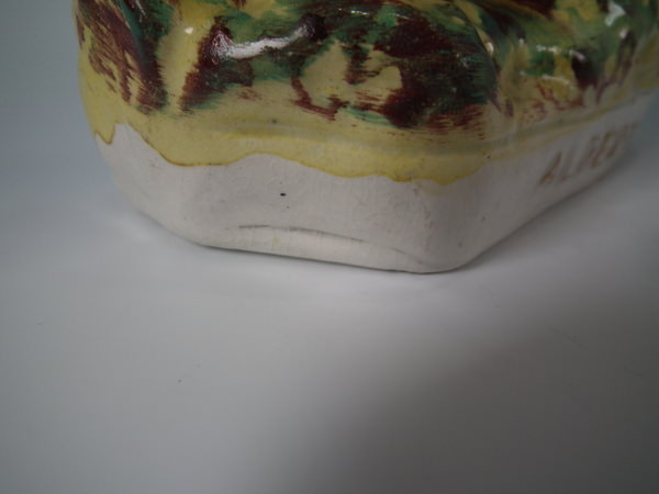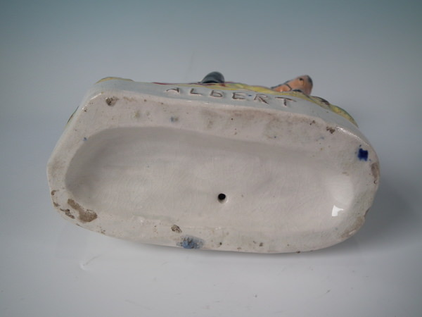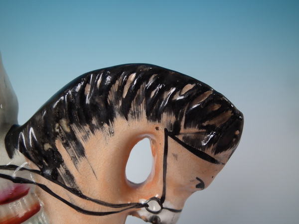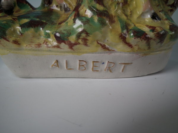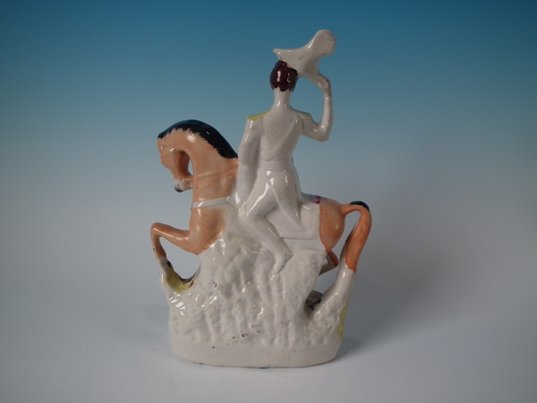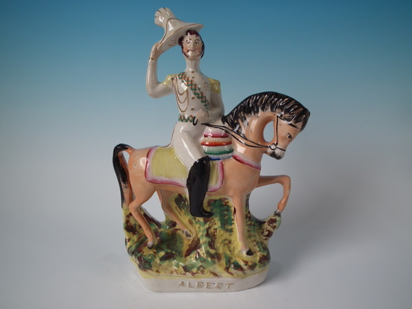 Victorian, circa 1860. 11.4ins high, 8.1ins wide, 3.1ins depth. Staffordshire figure with a royalty theme which features Prince Albert on horseback, stood on a shaped base.