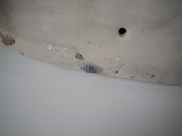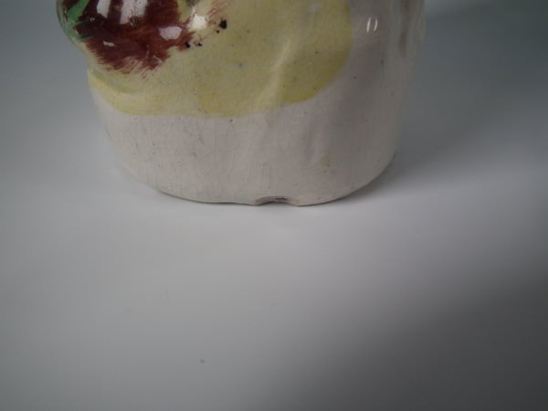 Multi-coloured version. Dull gilt embellishment. Decorated 'in the round' - decoration to front and reverse. Vent hole to the underside.