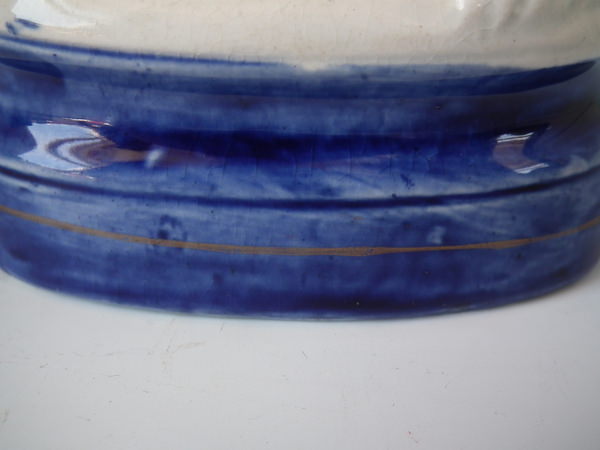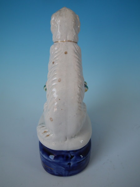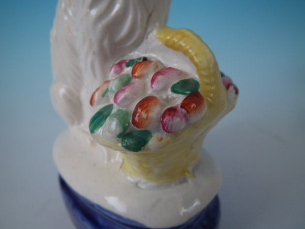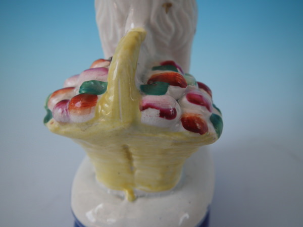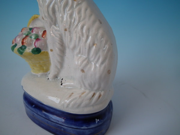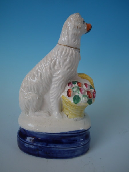 Victorian, circa 1860. 6.5ins high, 3.9ins wide, 2.6ins depth. Staffordshire figure which features a spaniel with a flower basket, seated on a cobalt blue base.