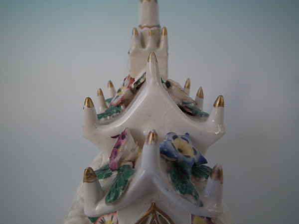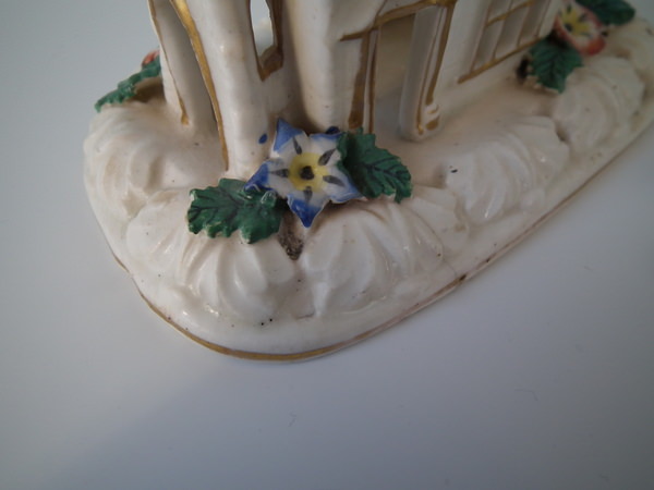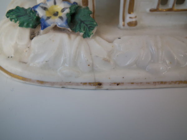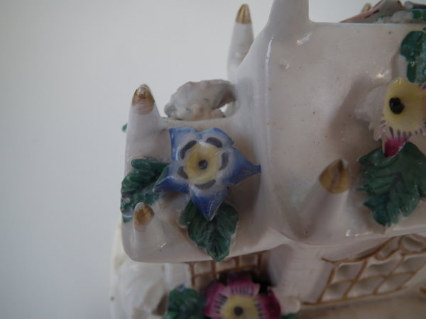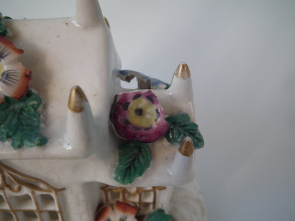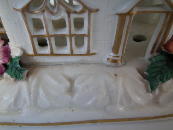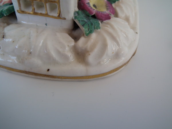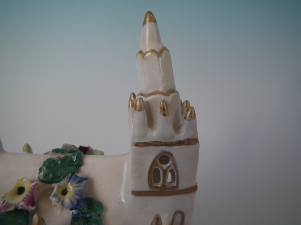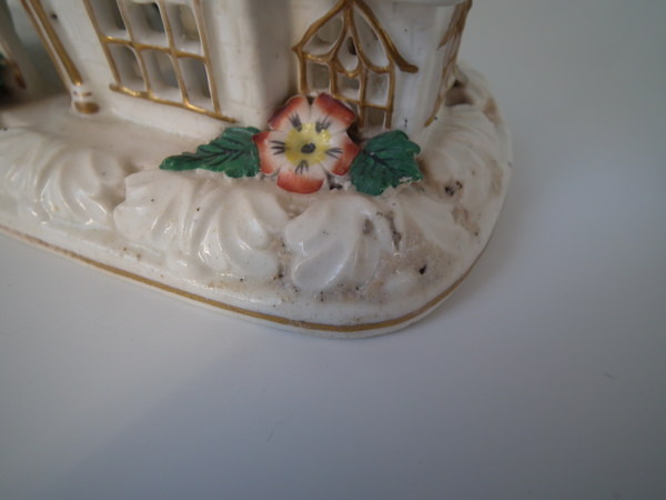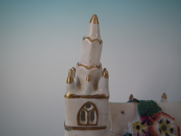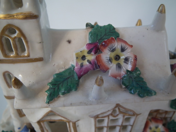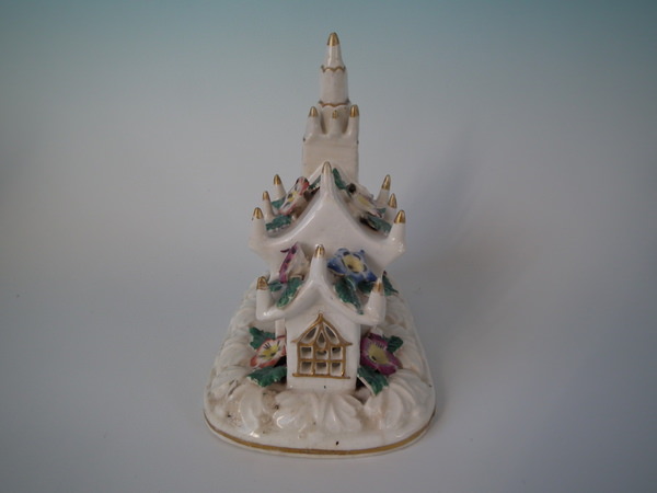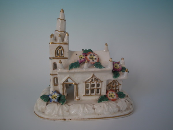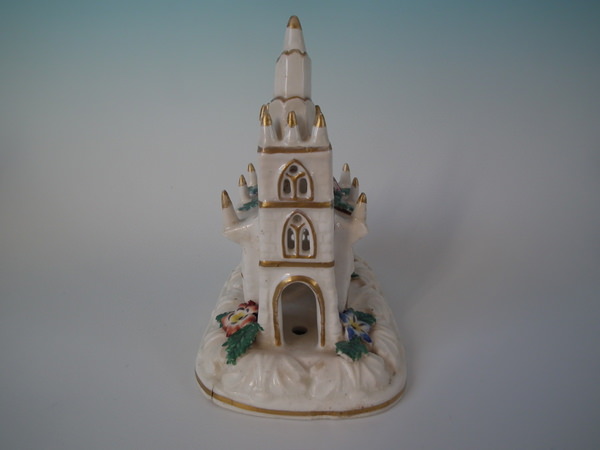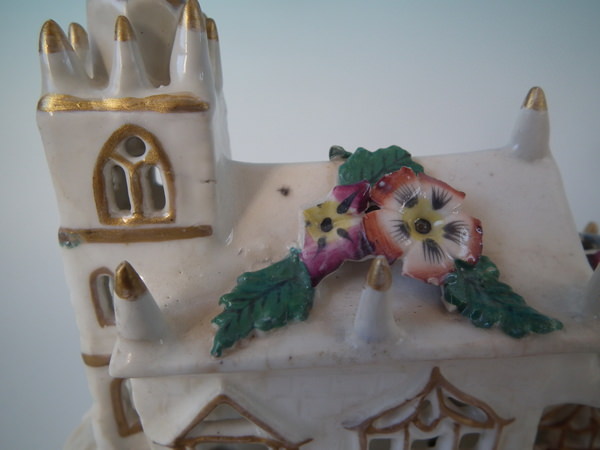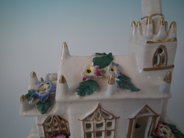 Victorian, circa 1850. 5.5ins high, 6.1ins wide, 3.7ins depth. Staffordshire porcellaneous pastille burner which features a church decorated in flowers, stood on a rectangular base.
