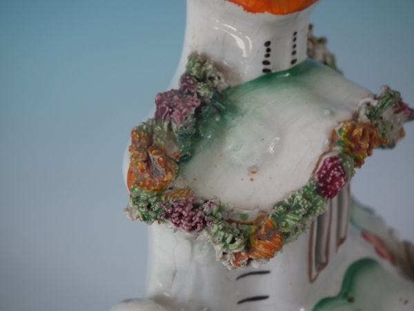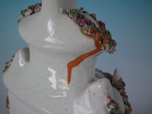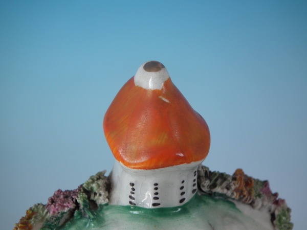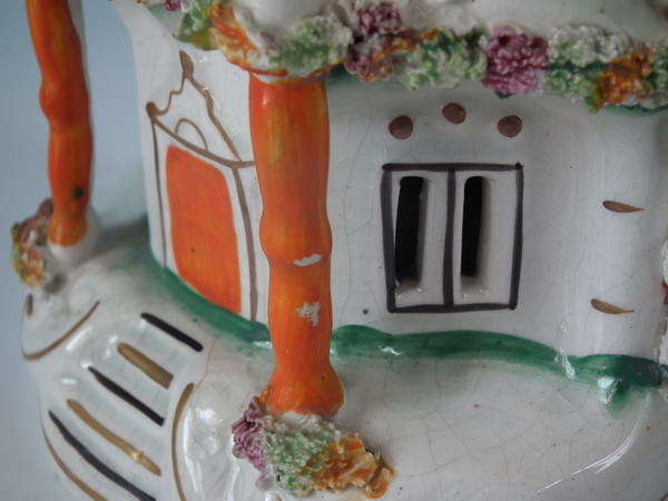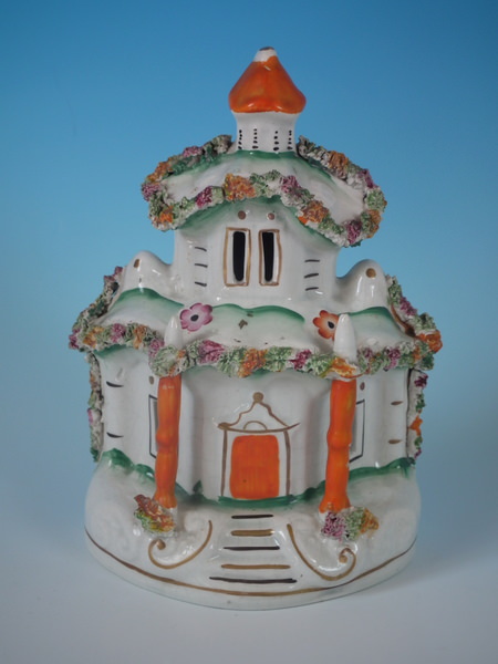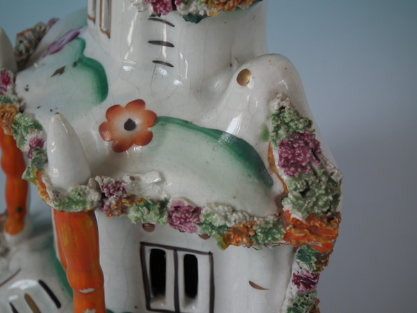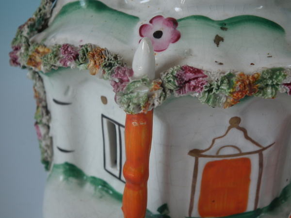 Victorian, circa 1860. 7.4ins high, 5.5ins wide, 3.5ins depth. Staffordshire cottage which features pierced windows and a turret,