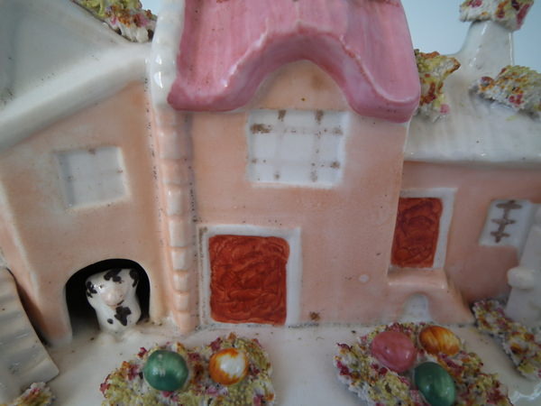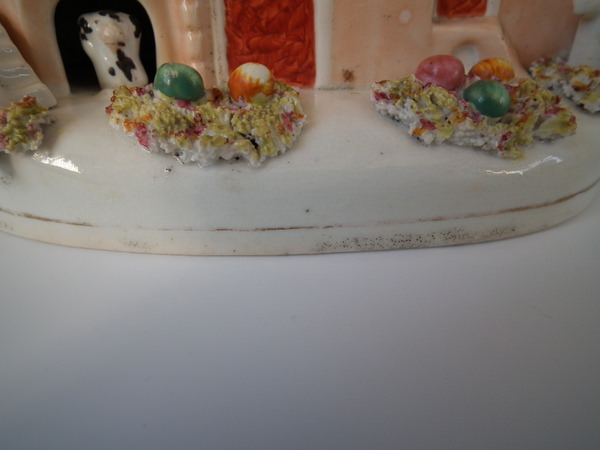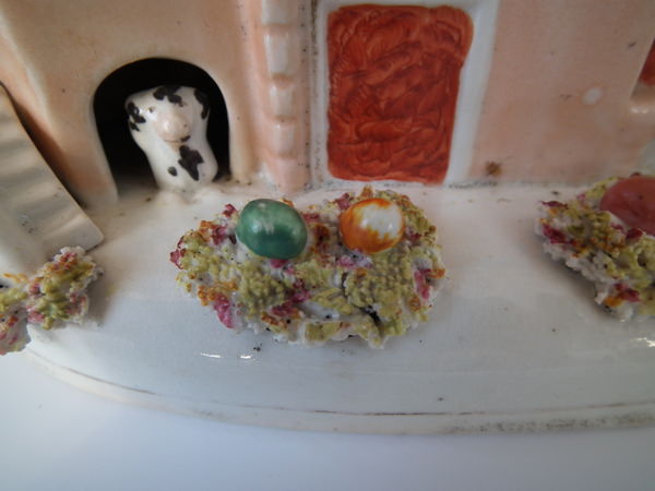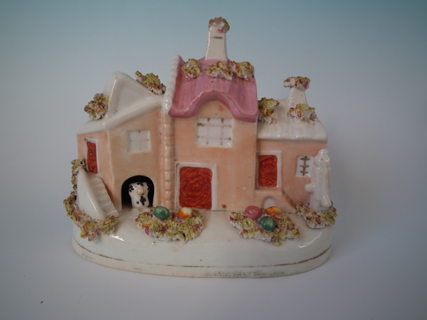 Victorian, circa 1860. 5.1ins high, 6.3ins wide, 2.9ins depth. Staffordshire porcellaneous cottage with a pastoral theme which features a dog sitting in a doorway, stood on an oval base. Multi-coloured version.