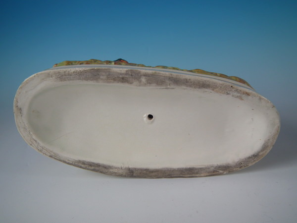 Victorian, circa 1880. 9.4ins high, 10.8ins wide, 5.1ins depth. Staffordshire figure which features a lion, recumbent on an oblong base.