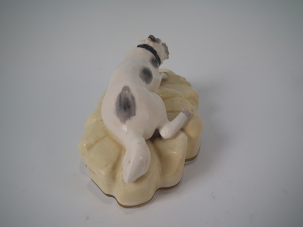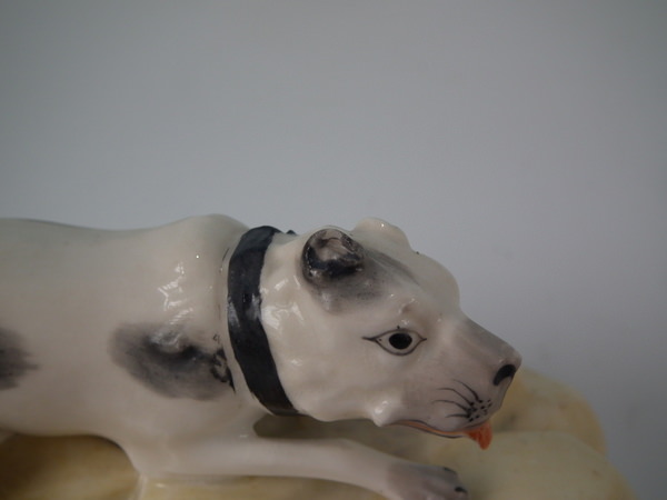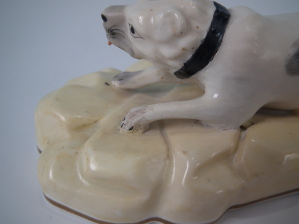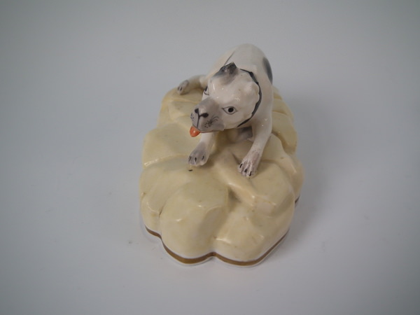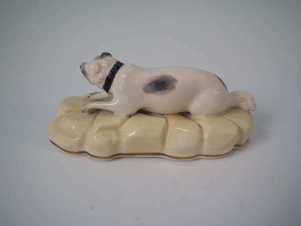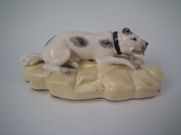 Victorian, circa 1840. 2.5ins high, 5.6ins wide, 2.8ins depth. Alcock Staffordshire figure which features a dog, possibly a Mastiff, recumbent on a shaped hollow base. Black and white version. Dull gilt base line.
